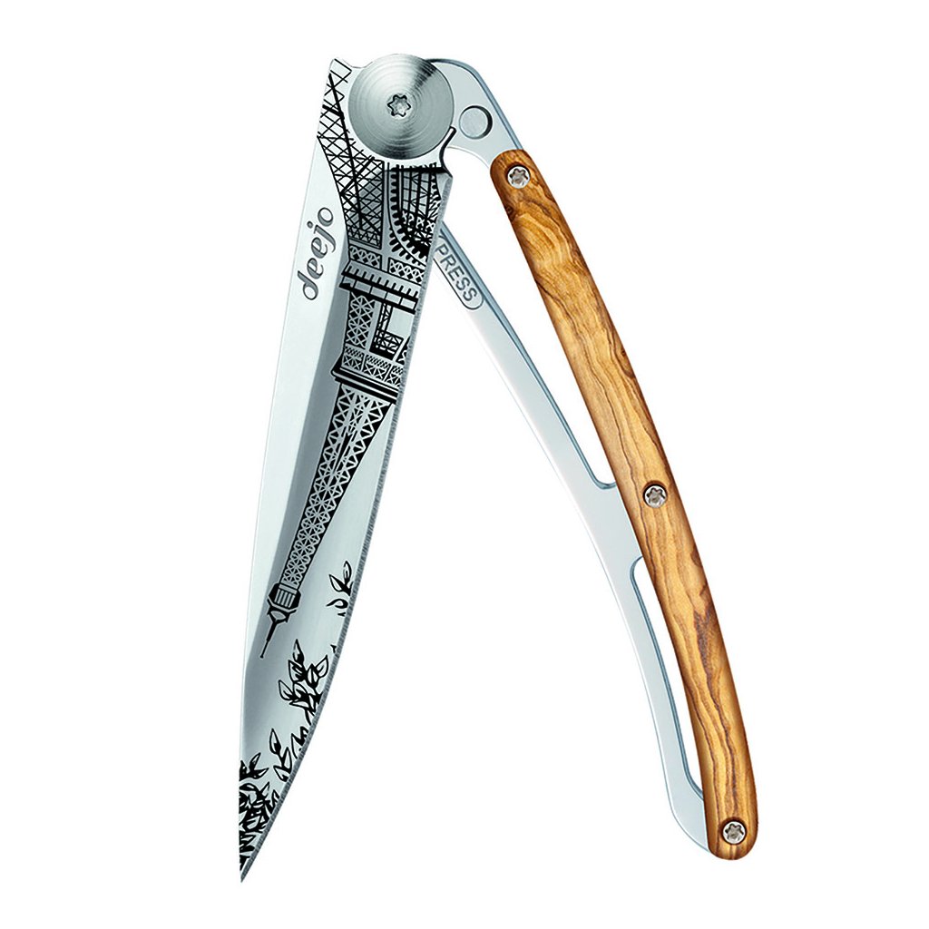 Stylový ultralehký nůž Deejo z kolekce Mirror se střenkou z olivového dřeva a čepelí s vysokým leskem a tetováním "Eiffel Tower".