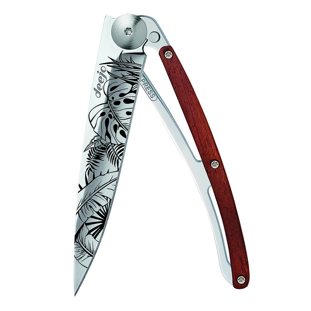Stylový ultralehký nůž Deejo z kolekce Mirror se střenkou z exotického dřeva coralwood a čepelí s vysokým leskem a tetováním "Jungle".