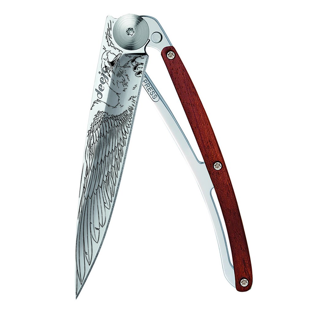 Stylový ultralehký nůž Deejo z kolekce Mirror se střenkou z exotického dřeva coralwood a čepelí s vysokým leskem a tetováním "Eagle".
