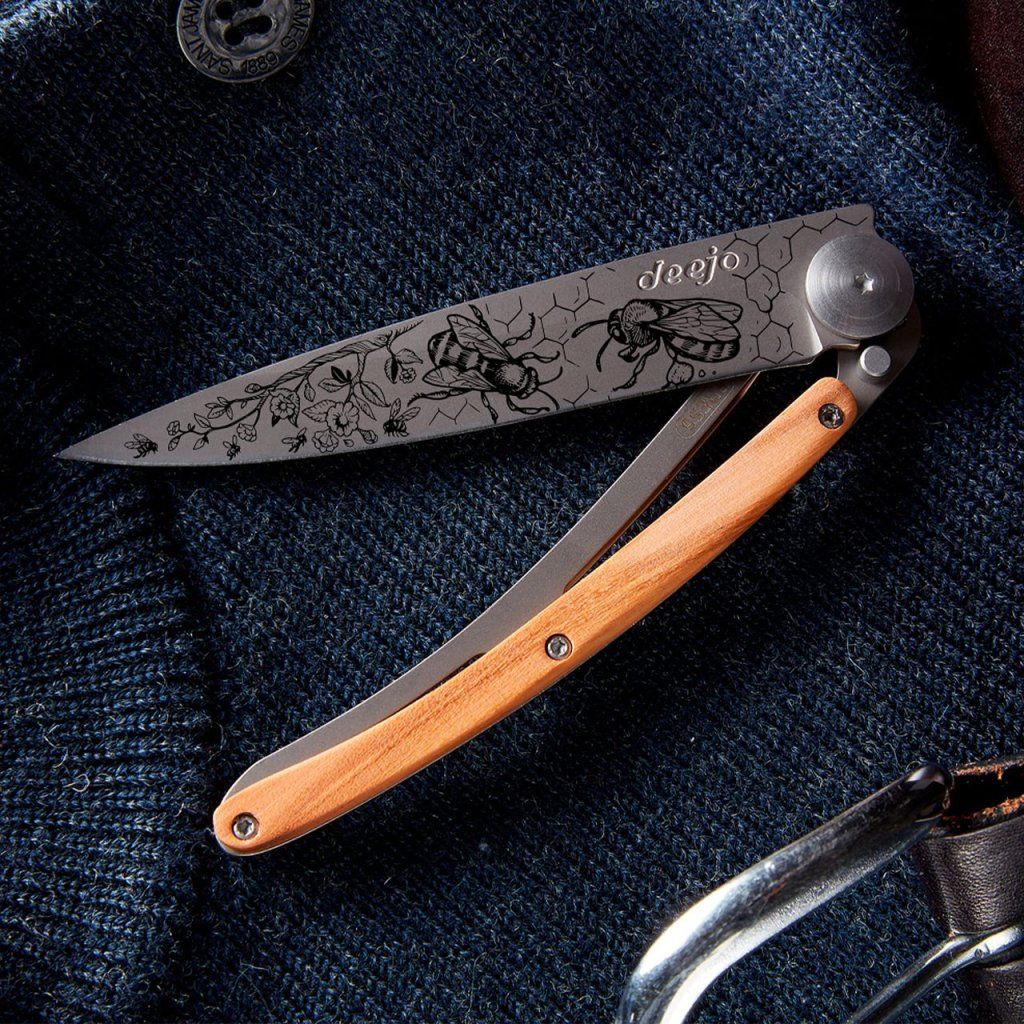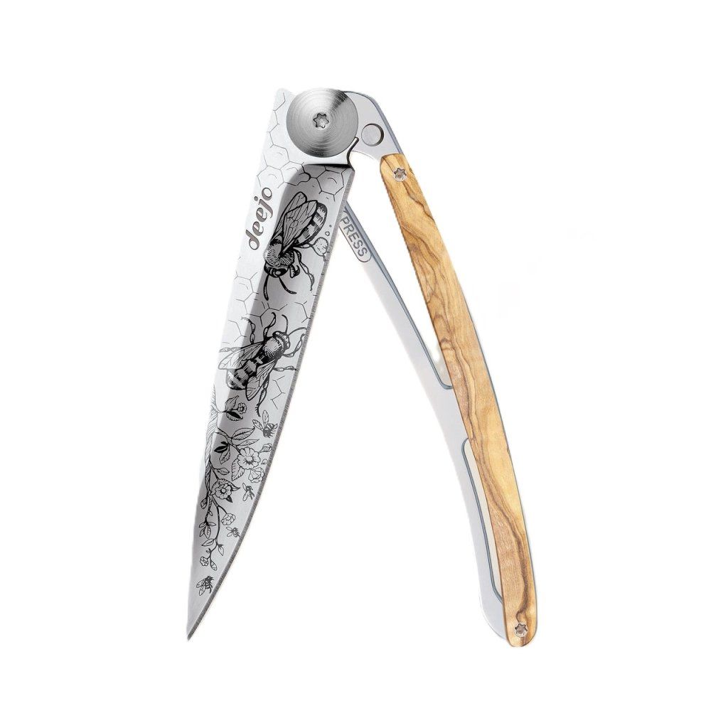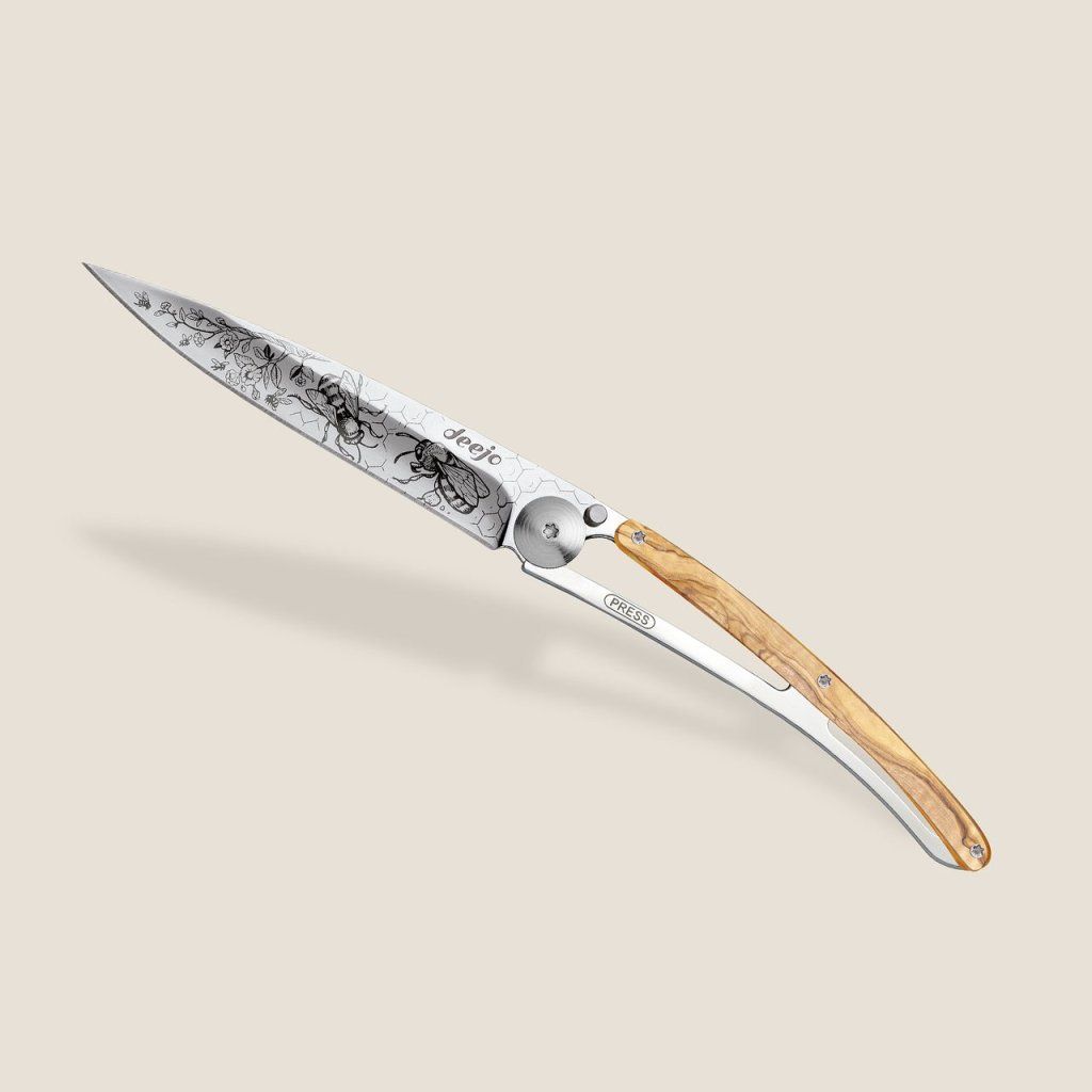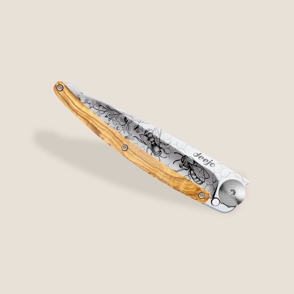 Stylový ultralehký nůž Deejo z kolekce Mirror se střenkou z olivového dřeva a čepelí s vysokým leskem a tetováním "včely".