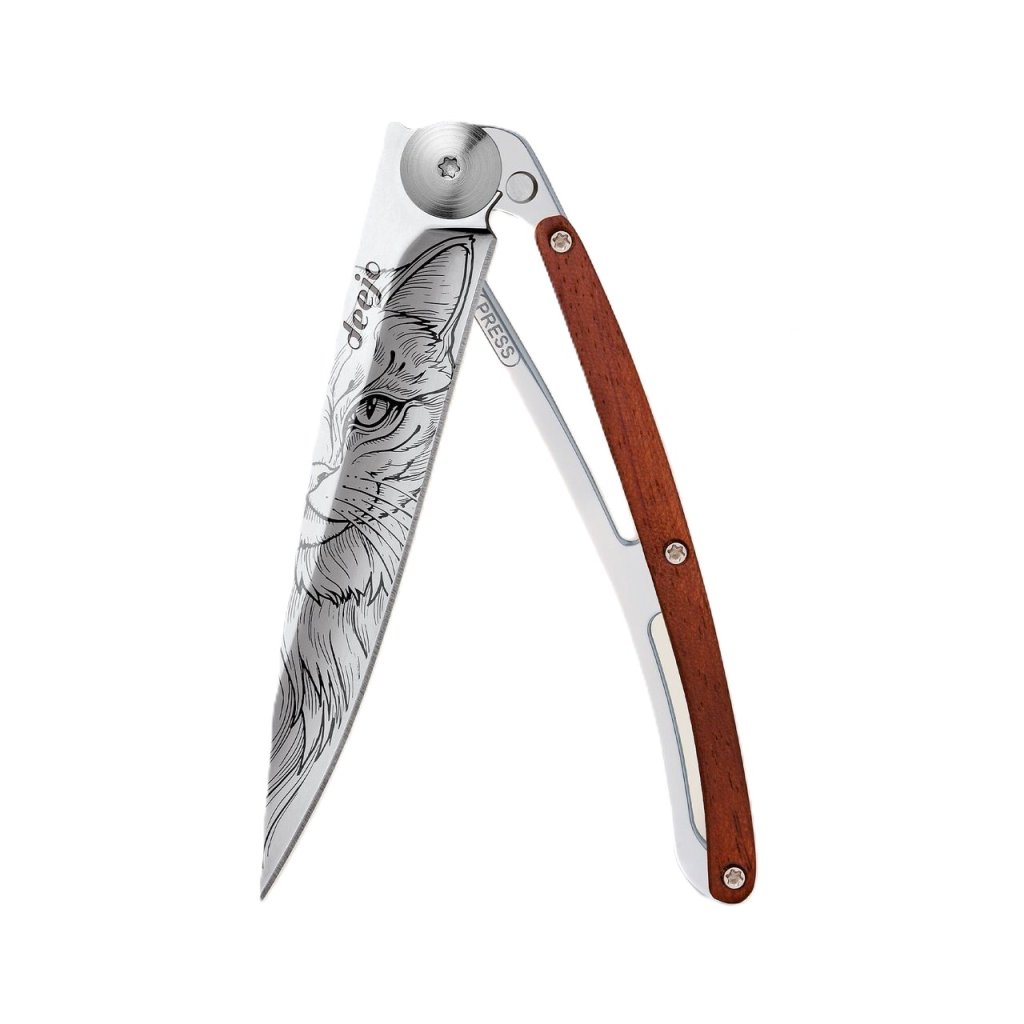 Stylový ultralehký nůž Deejo z kolekce Mirror se střenkou z exotického dřeva coralwood a čepelí s vysokým leskem a tetováním "kočky".