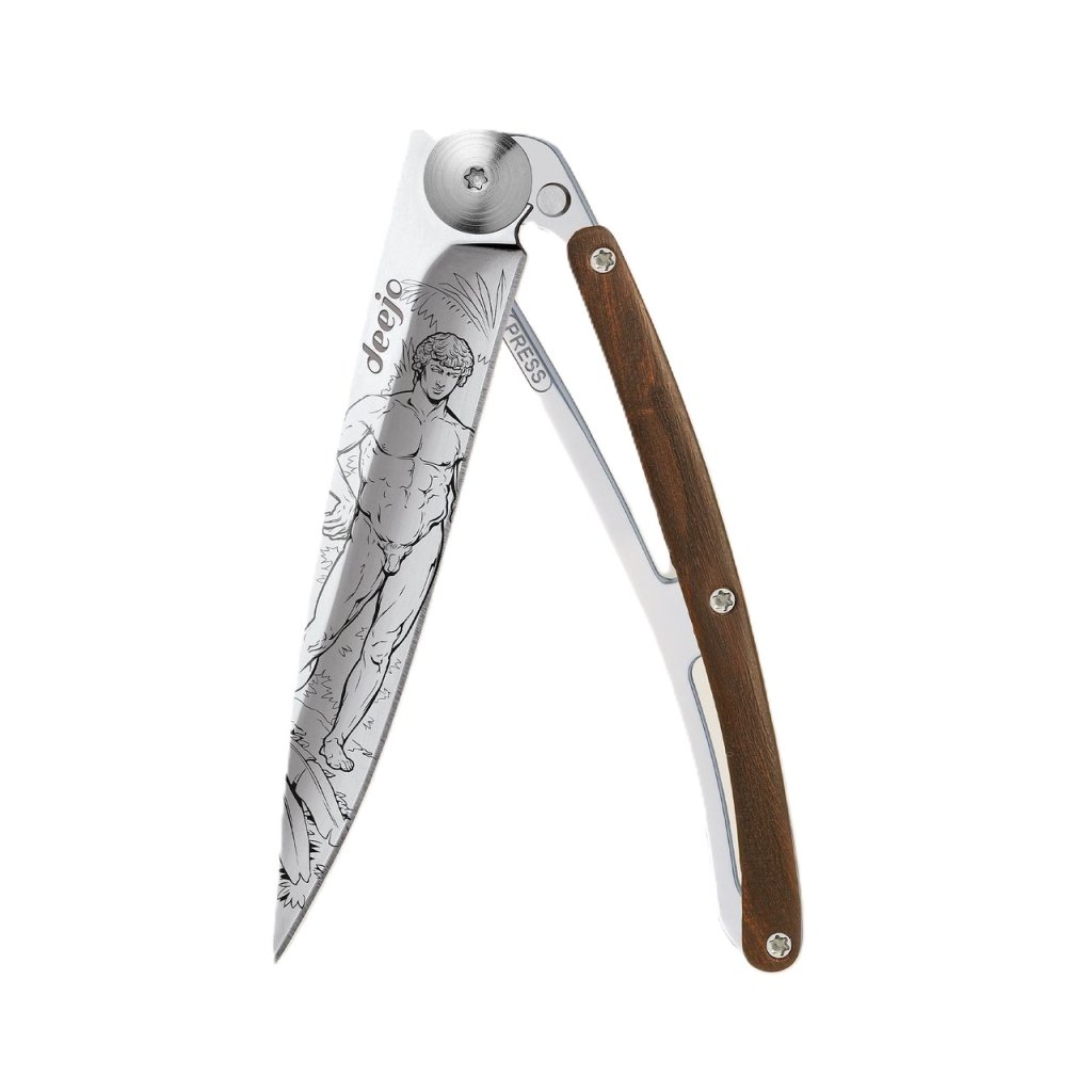 Stylový ultralehký nůž Deejo 37g z limitované série 999 kusů se střenkou z exotického dřeva snakewood a oboustranným tetováním Apollo.
