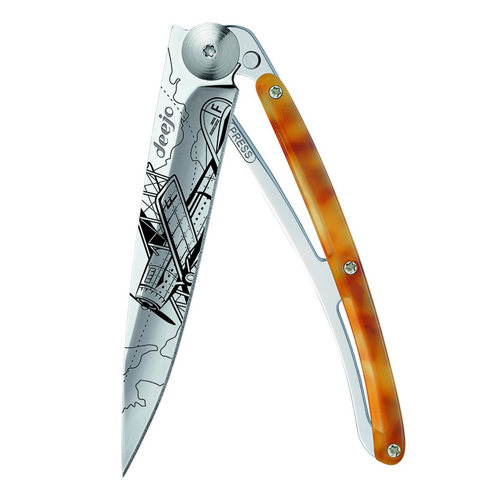 Stylový ultralehký nůž Deejo z kolekce Turtle se střenkou ze syntetické želvoviny a čepelí s vysokým leskem a tetovnáním "aviation".