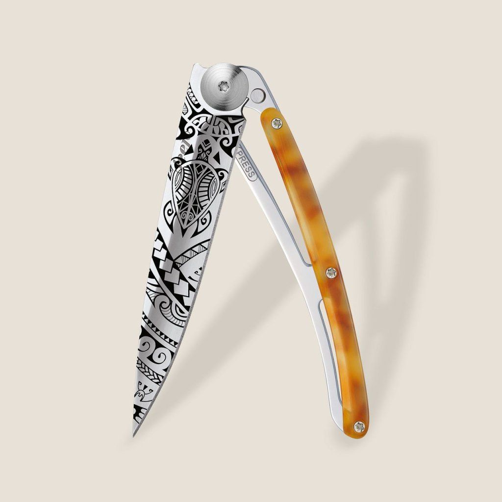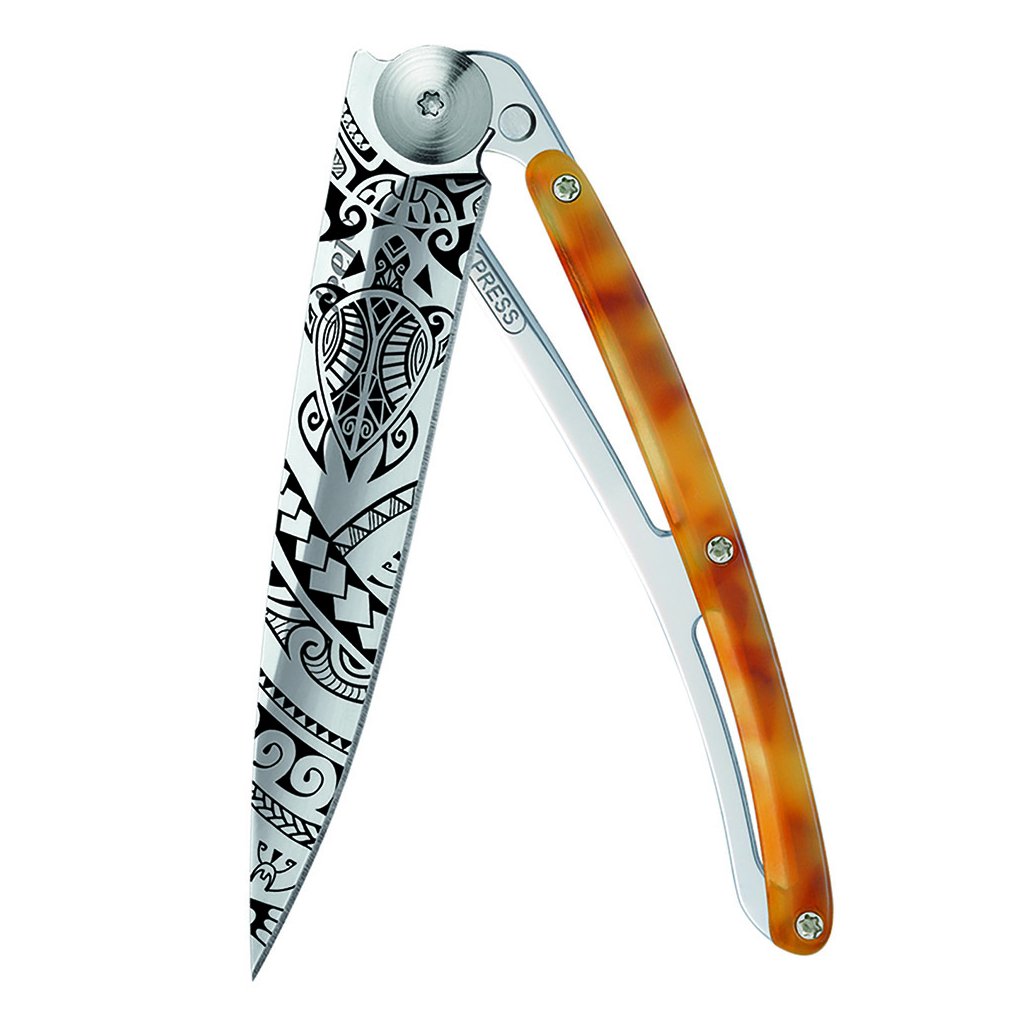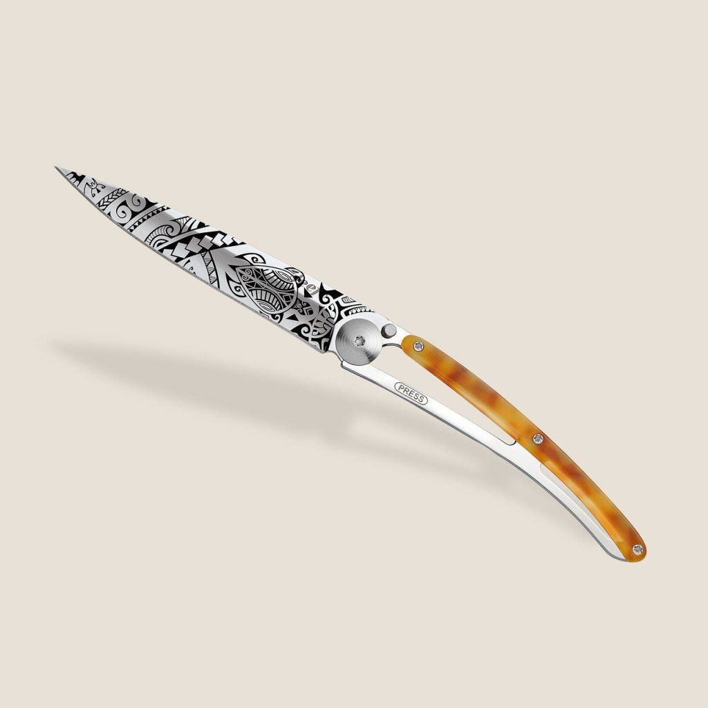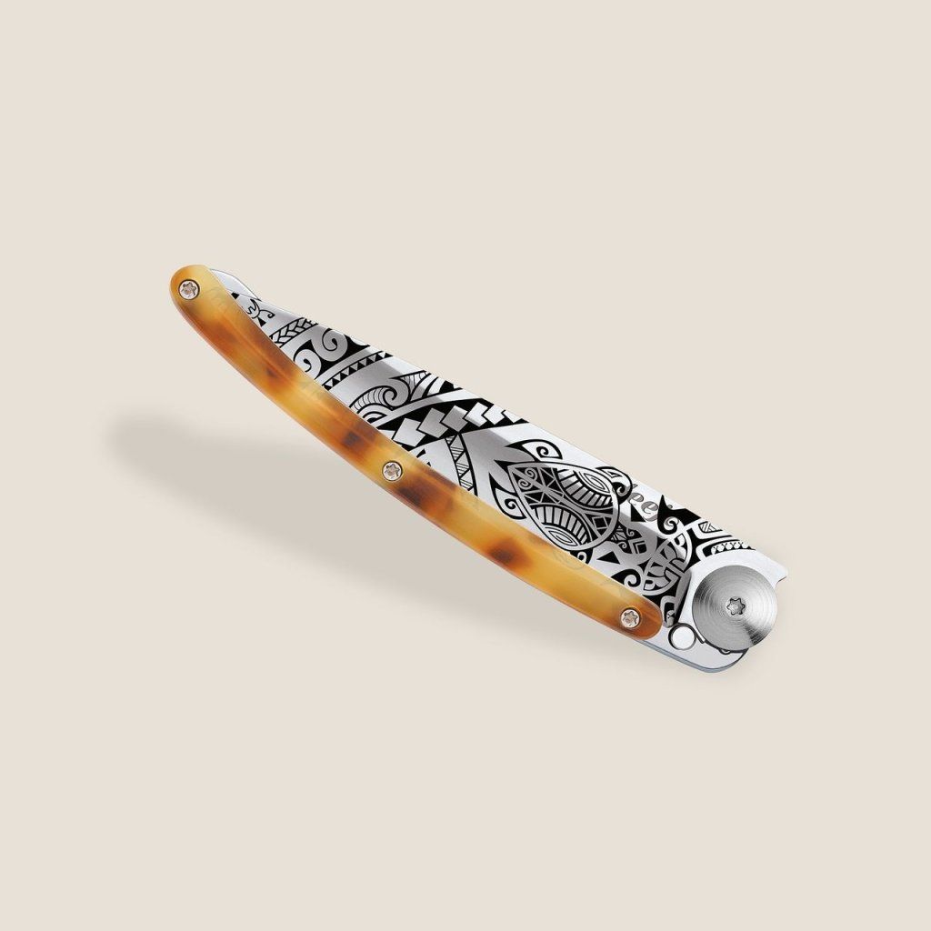 Stylový ultralehký nůž Deejo z kolekce Turtle se střenkou ze syntetické želvoviny a čepelí s vysokým leskem a tetovnáním "Polynesia".
