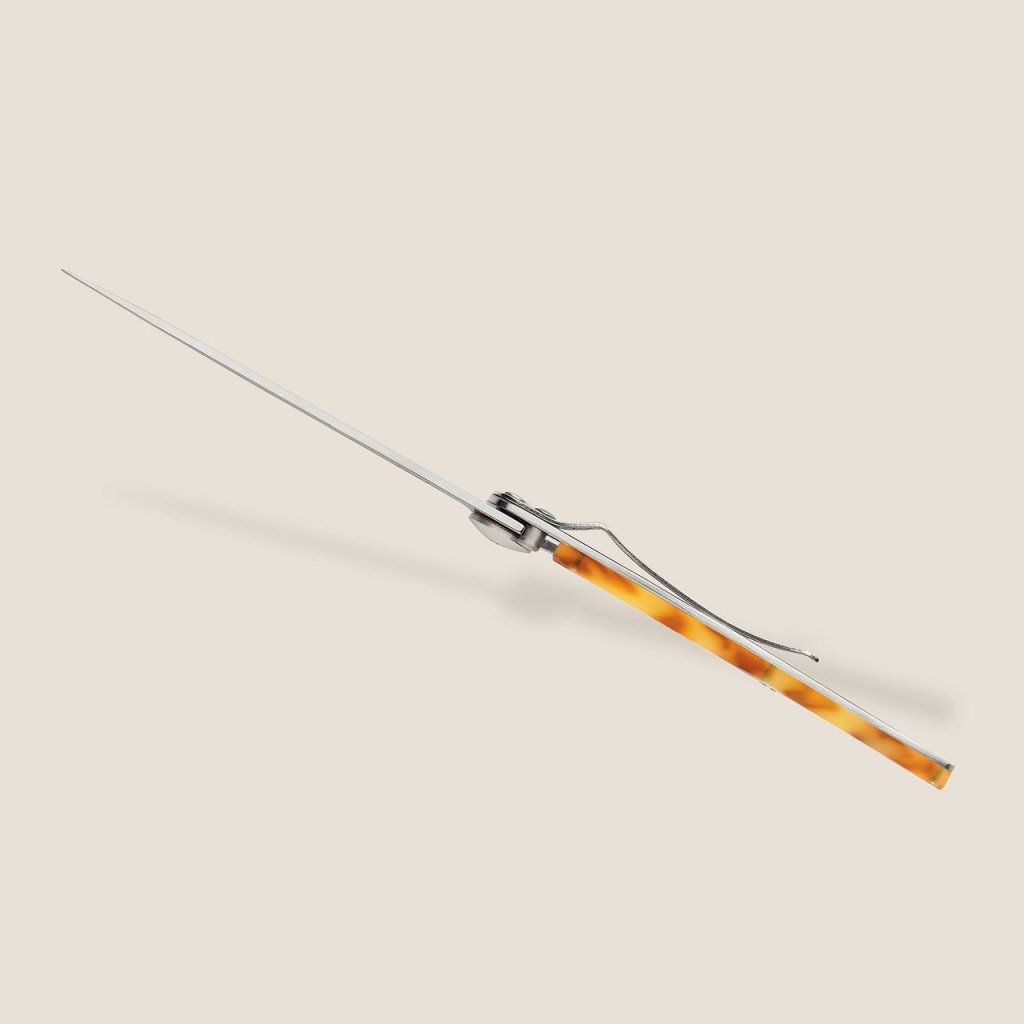 Střenka ze syntetické želvoviny pasuje nůž na elegantní doplněk.