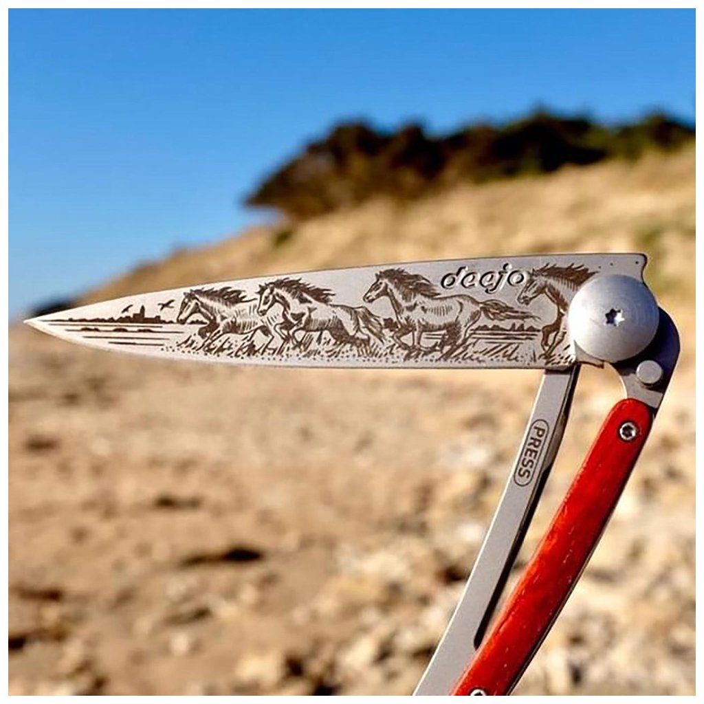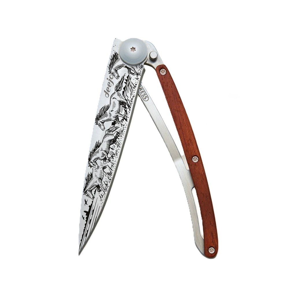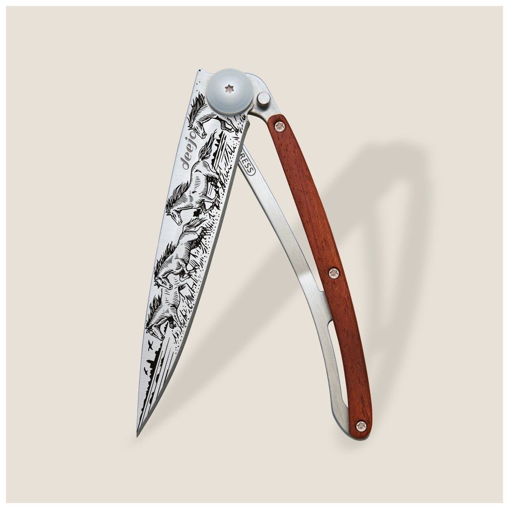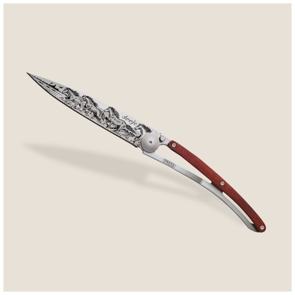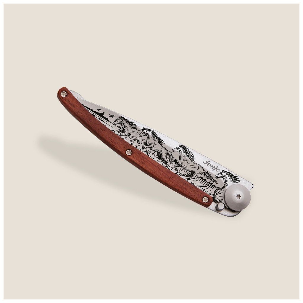 Stylový ultralehký nůž Deejo se střenkou z exotického dřeva coralwood a tetováním koně.