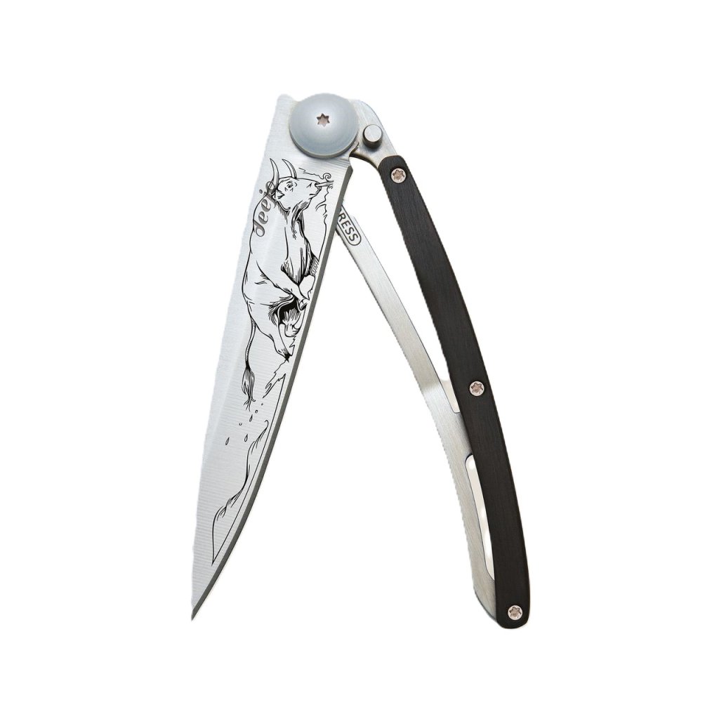 Stylový ultralehký nůž Deejo se střenkou z kořene exotického ebenového dřeva a motivem býka.