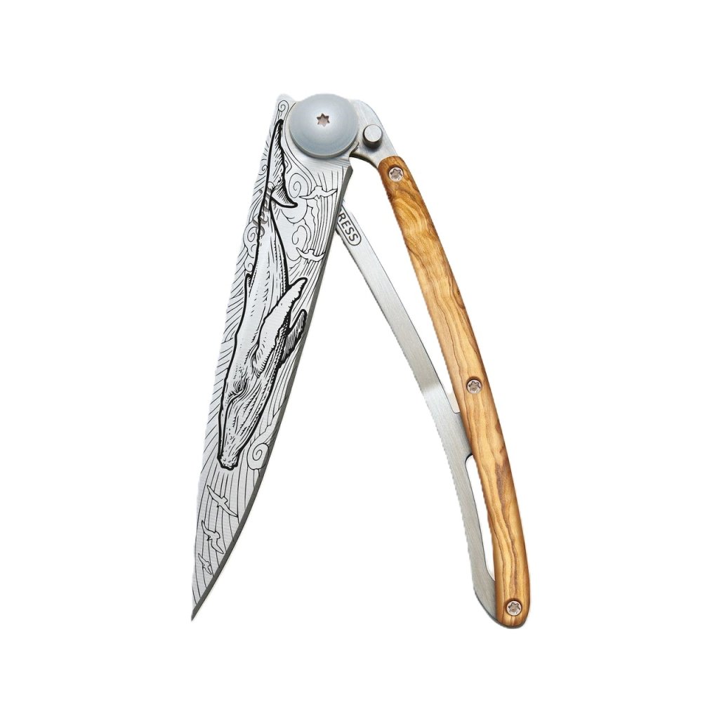 Stylový ultralehký nůž Deejo se střenkou z olivového dřeva a motivem velryby.