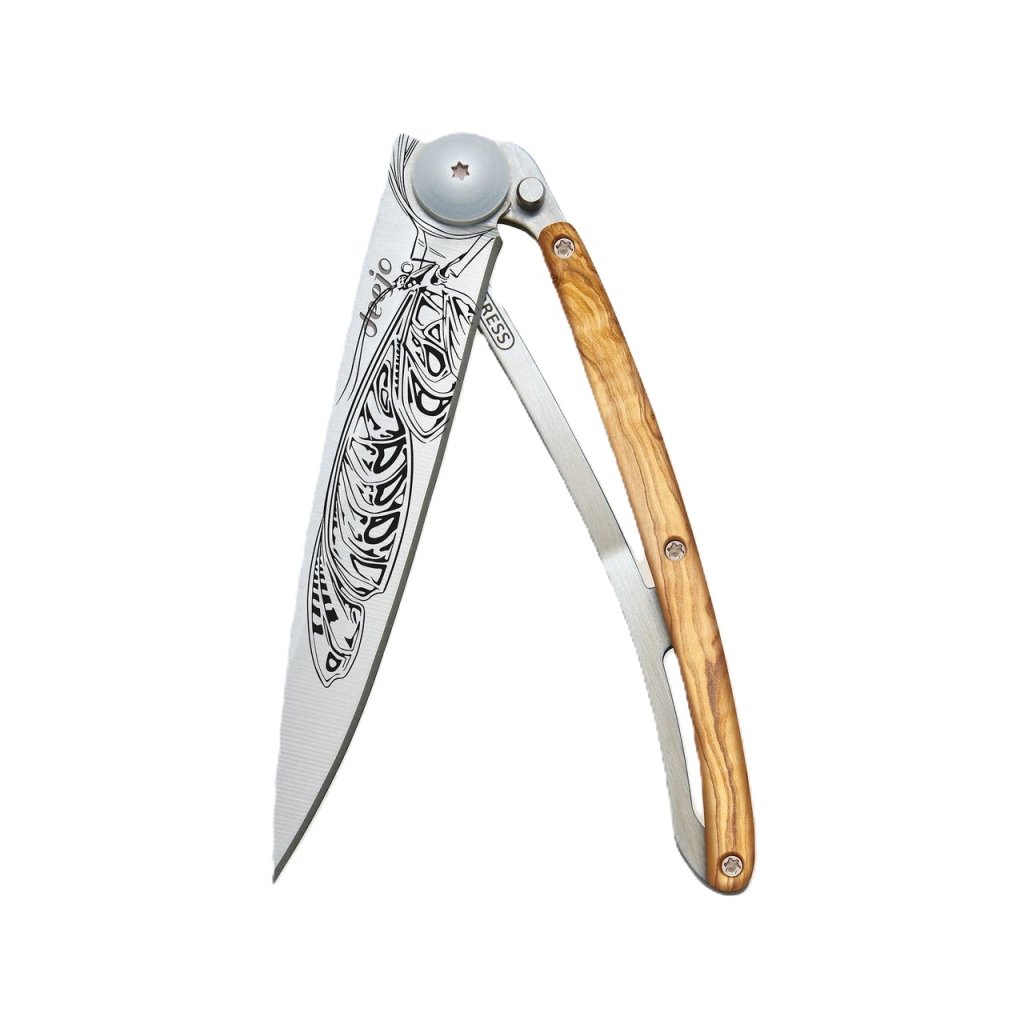 Stylový ultralehký nůž Deejo se střenkou z olivového dřeva a motivem motýla.