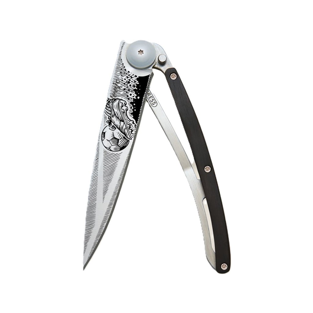 Stylový ultralehký nůž Deejo se střenkou z kořene exotického ebenového dřeva a motivem fotbal.