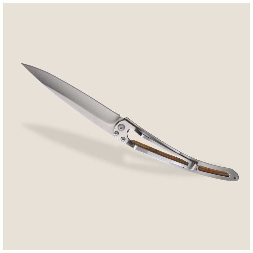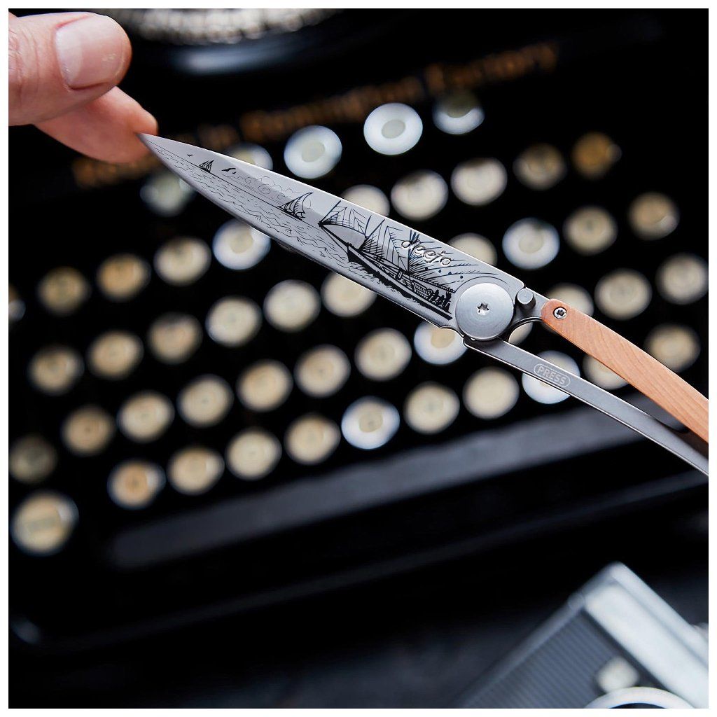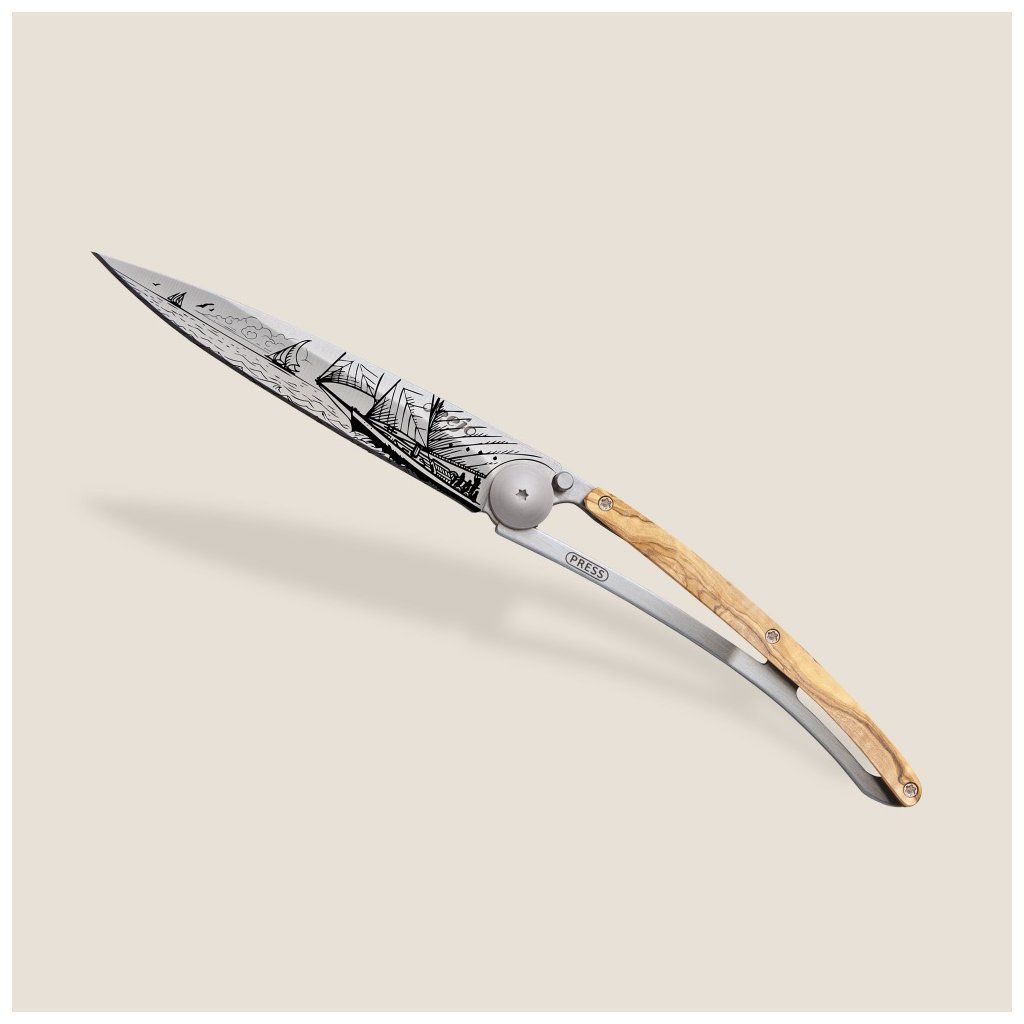 Stylový ultralehký nůž Deejo se střenkou z olivového dřeva a motivem plachetnic.