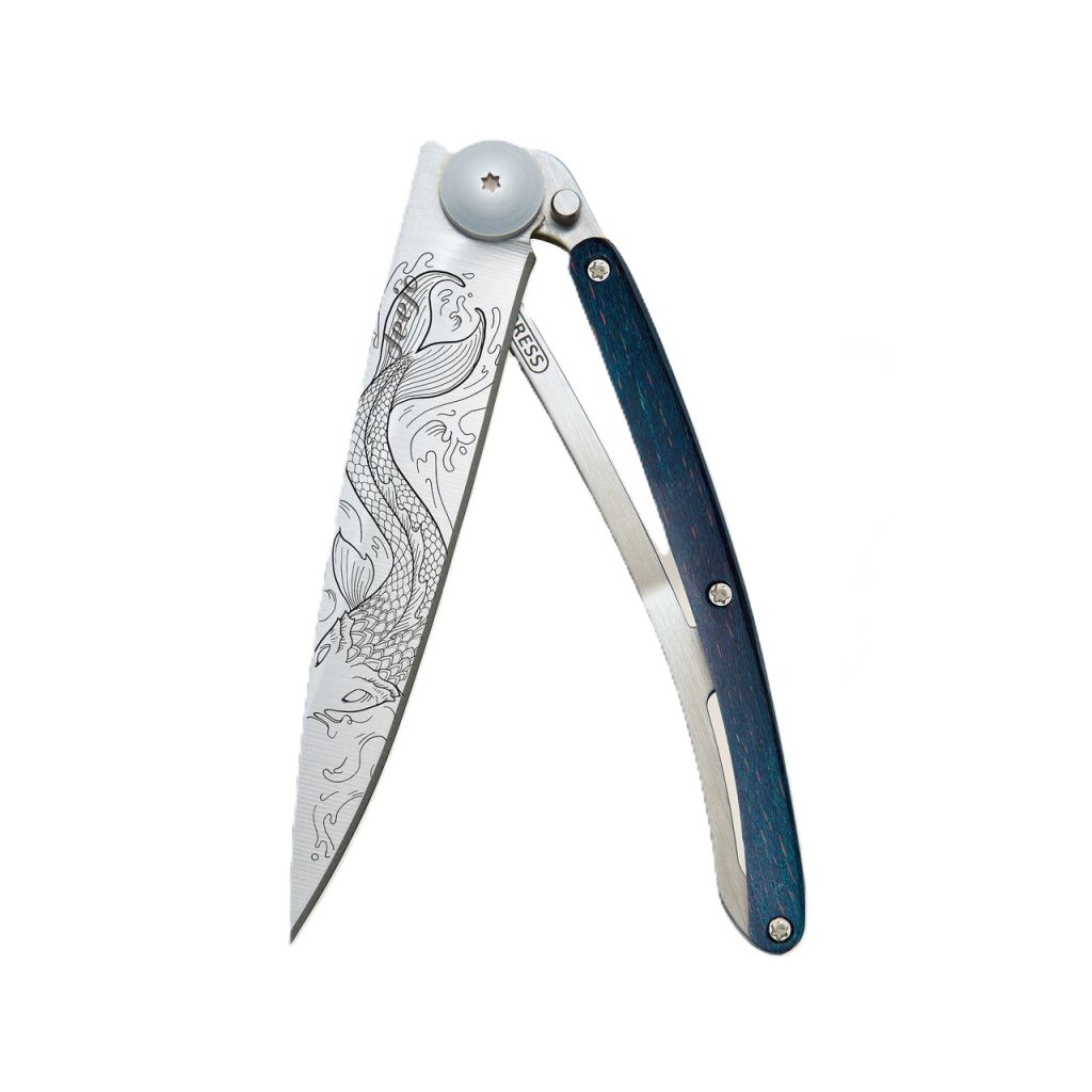 Stylový ultralehký nůž Deejo se střenkou z barevně mořeného bukového dřeva a motivem ryb.