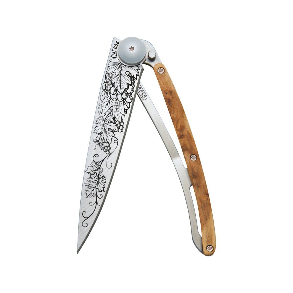 Stylový ultralehký nůž Deejo se střenkou z kořene exotického jalovce a tetováním hroznů.
