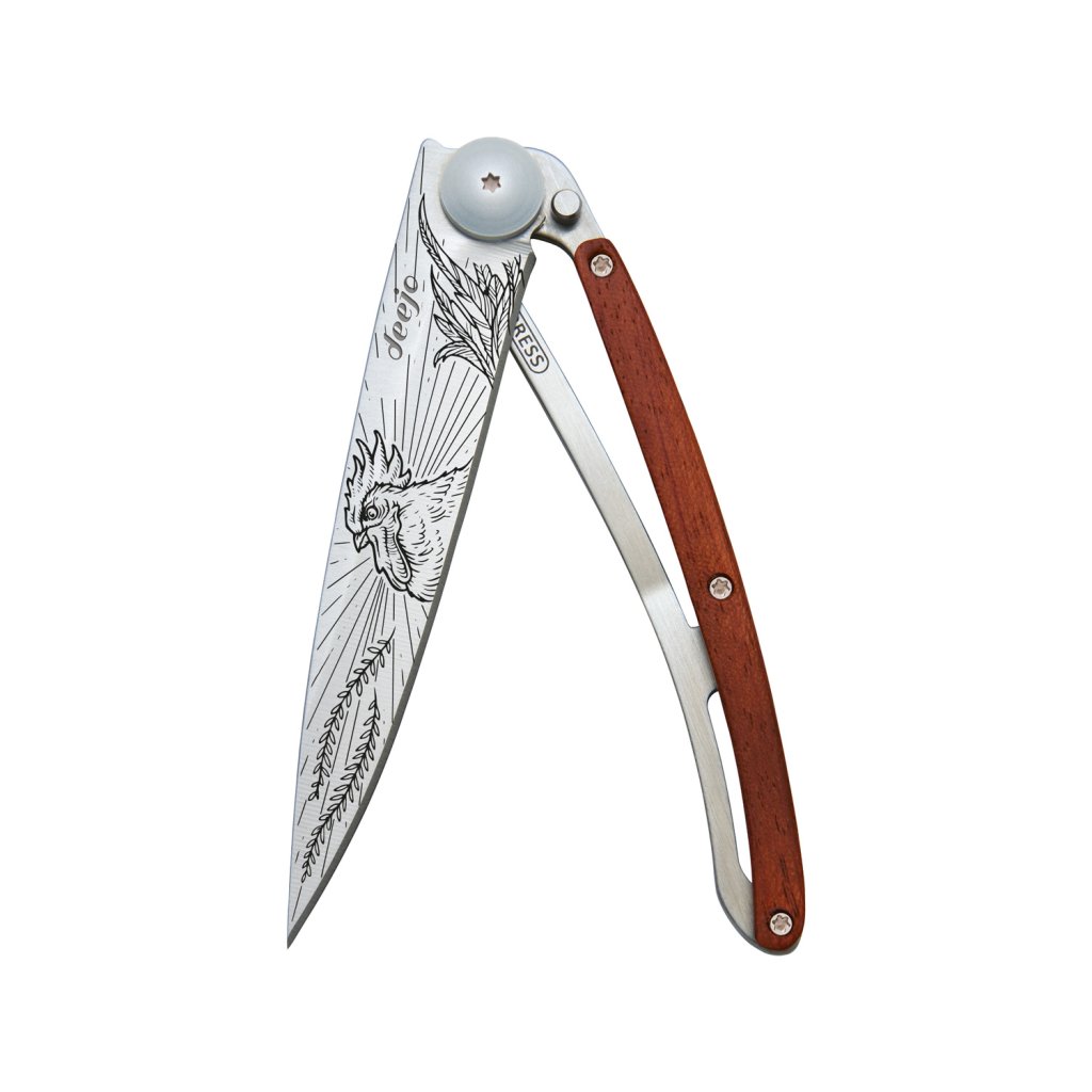 Stylový ultralehký nůž Deejo se střenkou z exotického dřeva coralwood a tetováním kohouta.