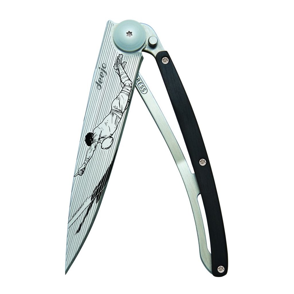 Stylový ultralehký nůž Deejo se střenkou z kořene exotického ebenového dřeva a tetováním rugby.