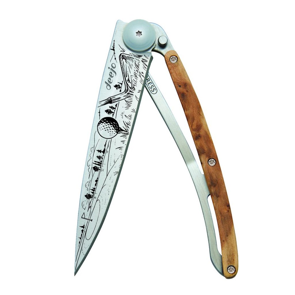 Stylový ultralehký nůž Deejo se střenkou z kořene exotického jalovce a tetováním golfu.