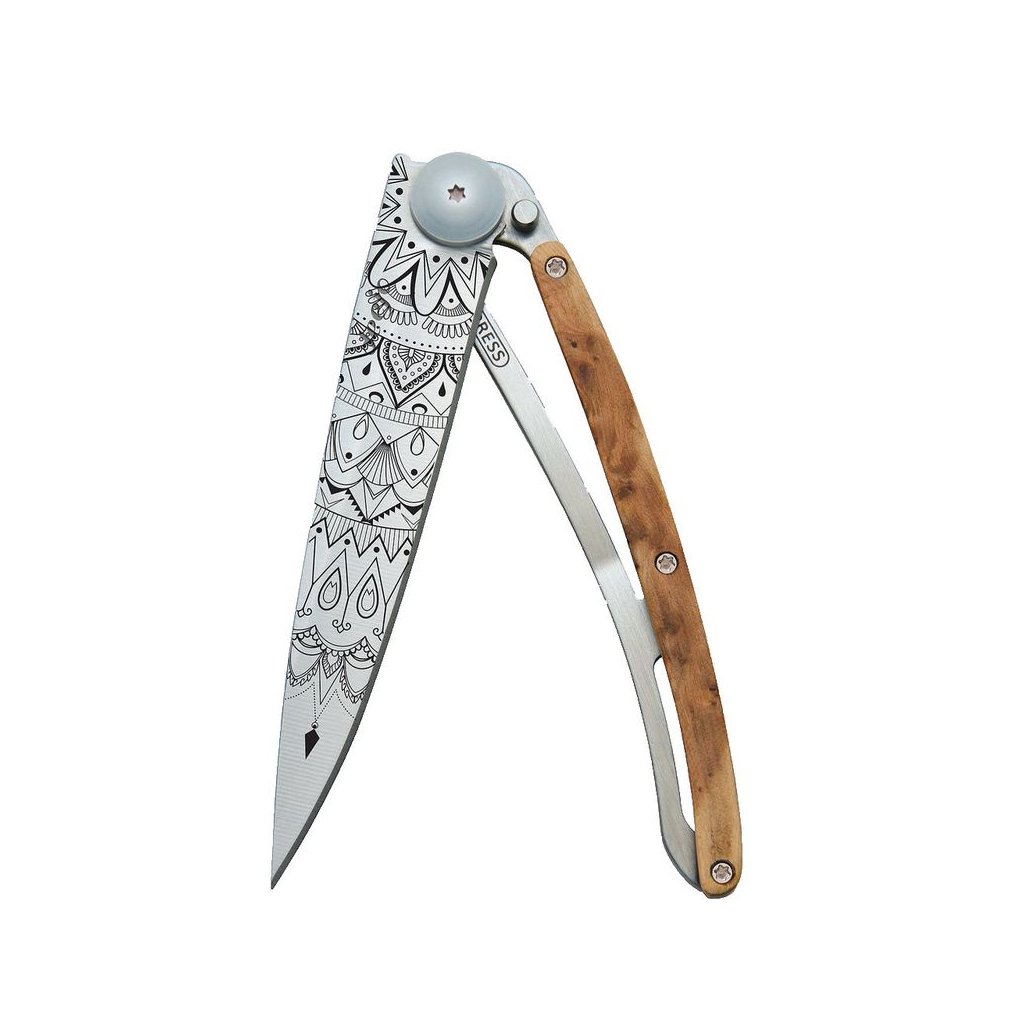 Stylový ultralehký nůž Deejo se střenkou z kořene exotického jalovce a tetováním mandaly.