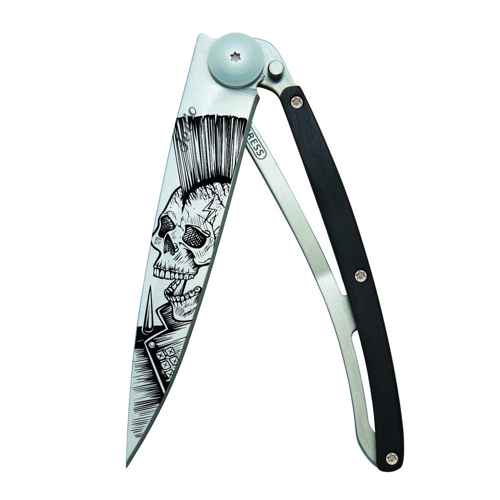 Stylový ultralehký nůž Deejo se střenkou z ebenového dřeva a tetováním "Punk".