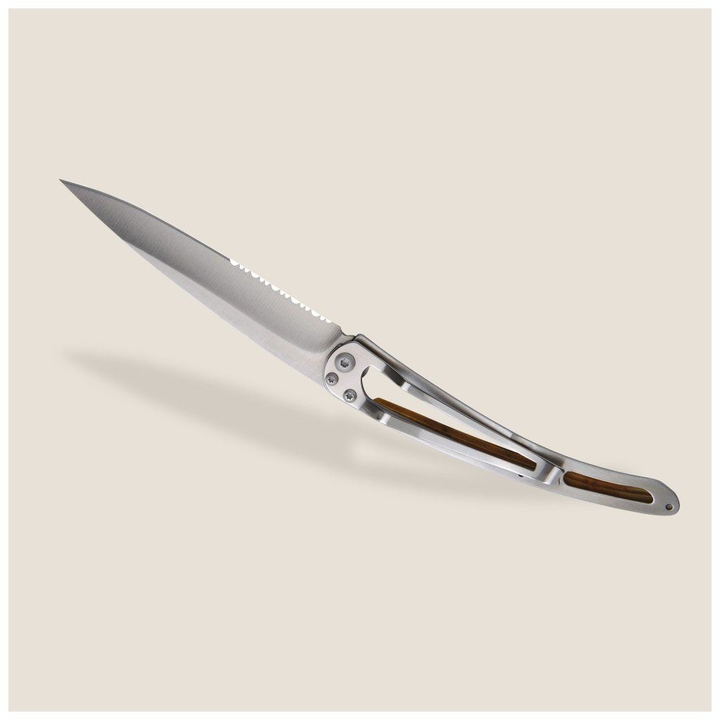 Dřevěná střenka z kořene exotického jalovce vyniká svou trvalou a pronikavou pepřovou vůní. Jalovcové vonné dřevo je odolné, lehké a pevné. Jemná kresba světlého dřeva na jednotlivých nožích variuje, každý nůž je tedy originál.
