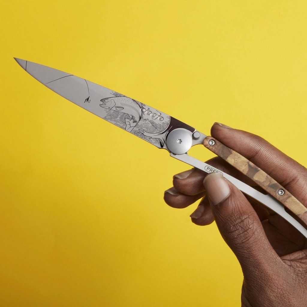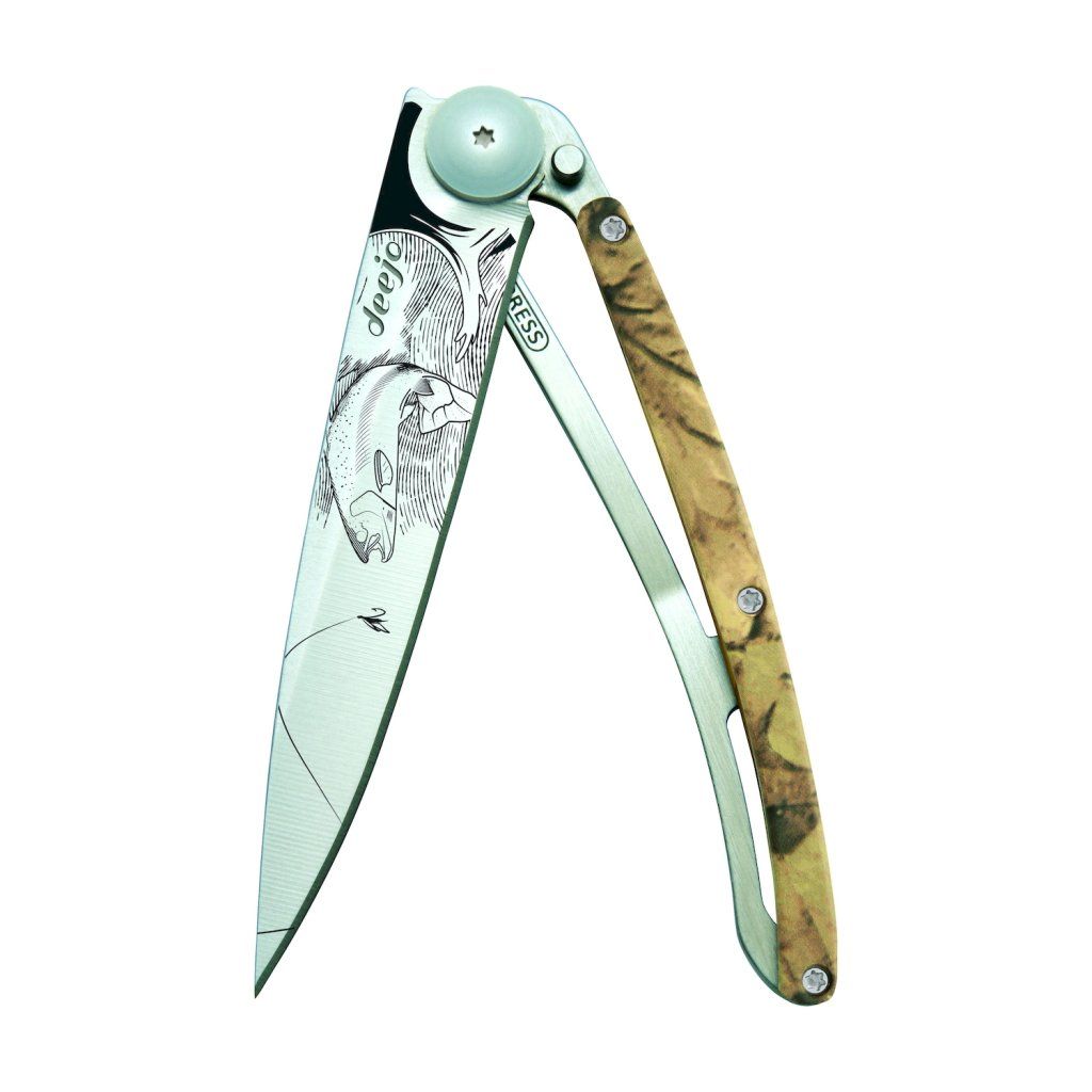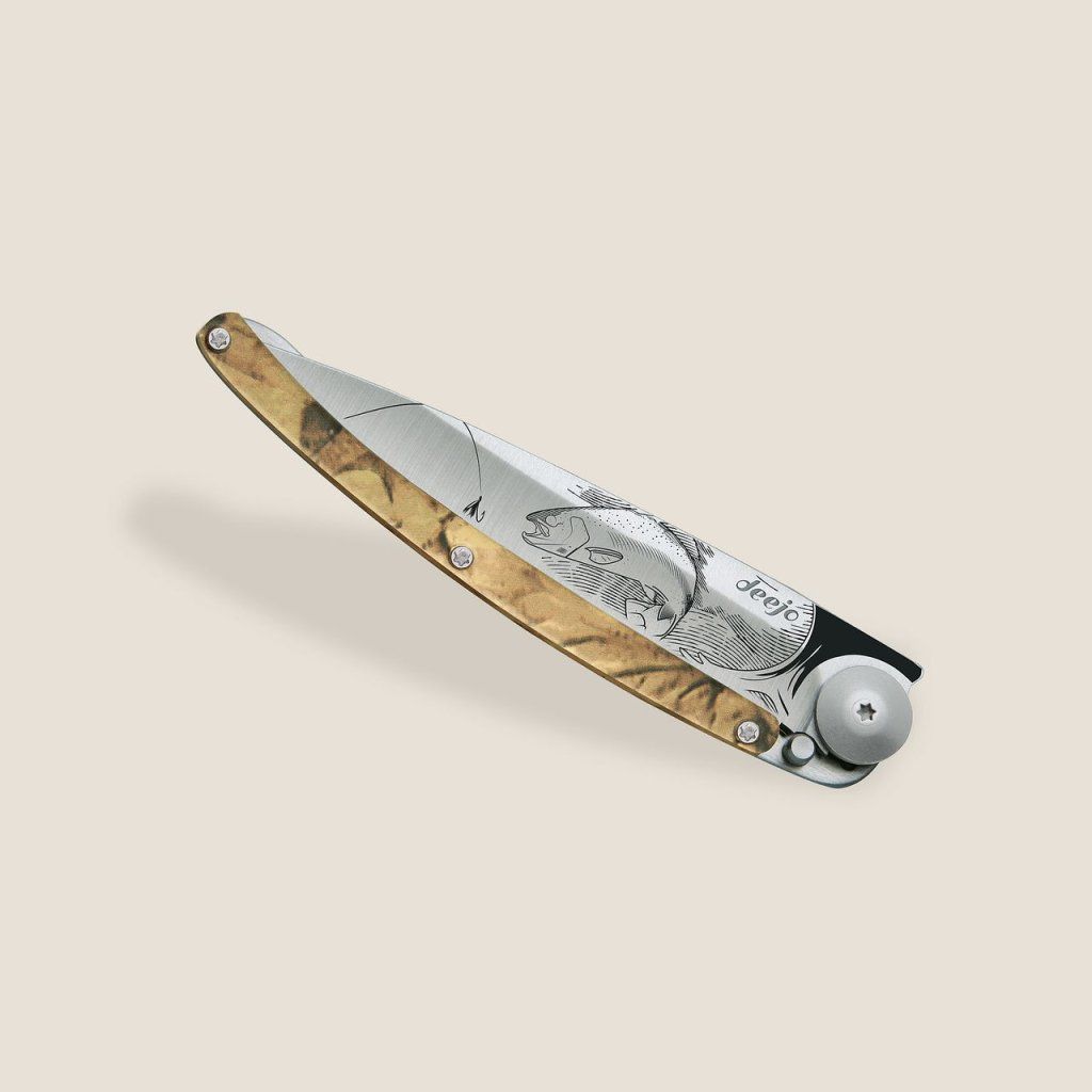 Stylový ultralehký nůž Deejo se střenkou z hliníku a tetováním pstruh.