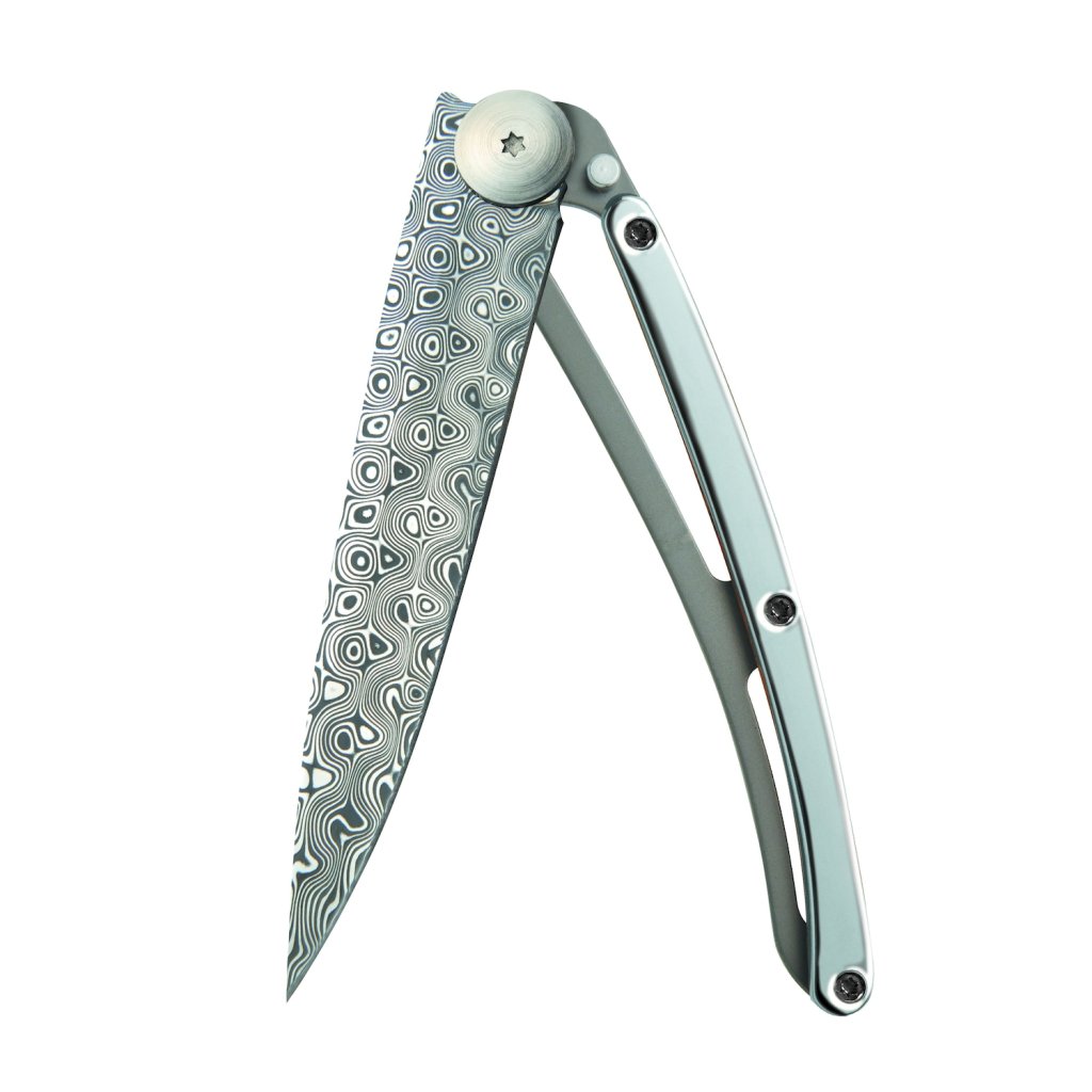 Jedinečný luxusní nůž Deejo s pokovením vrstvou 9k bílého zlata (palladia) a čepele z damascénské ocele dává vyniknout spojení moderního designu a tradičního materiálu. Součástí balení je i látkové pouzdro, mikrovlákno na očištění nože, dodáváno v luxusní černé krabičce.