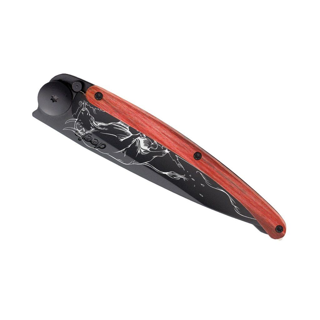 Stylový ultralehký nůž Deejo se střenkou z barevně mořeného bukového dřeva a motivem býk.