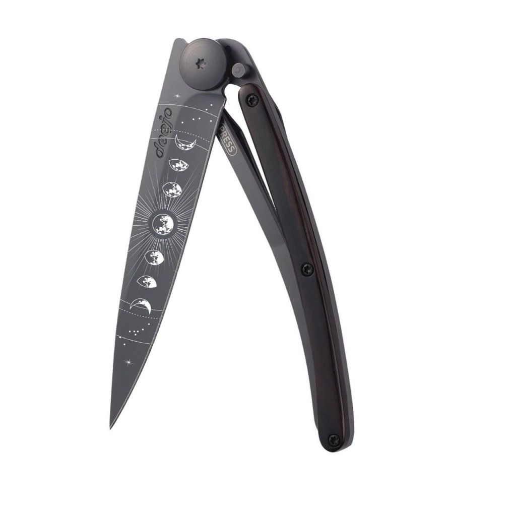 Stylový ultralehký nůž Deejo se střenkou z kořene exotického ebenového dřeva a motivem Měsíce.