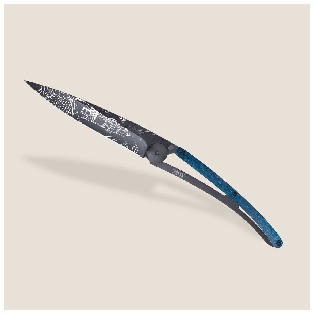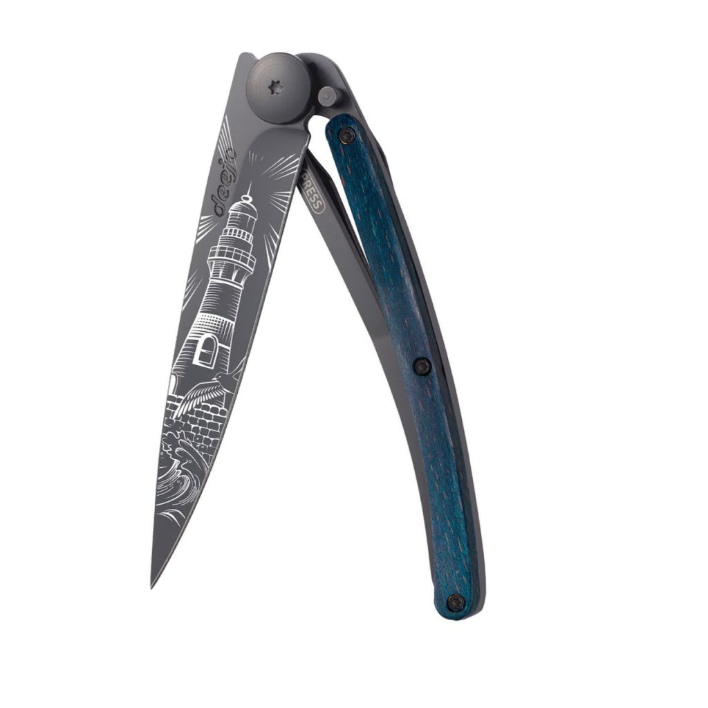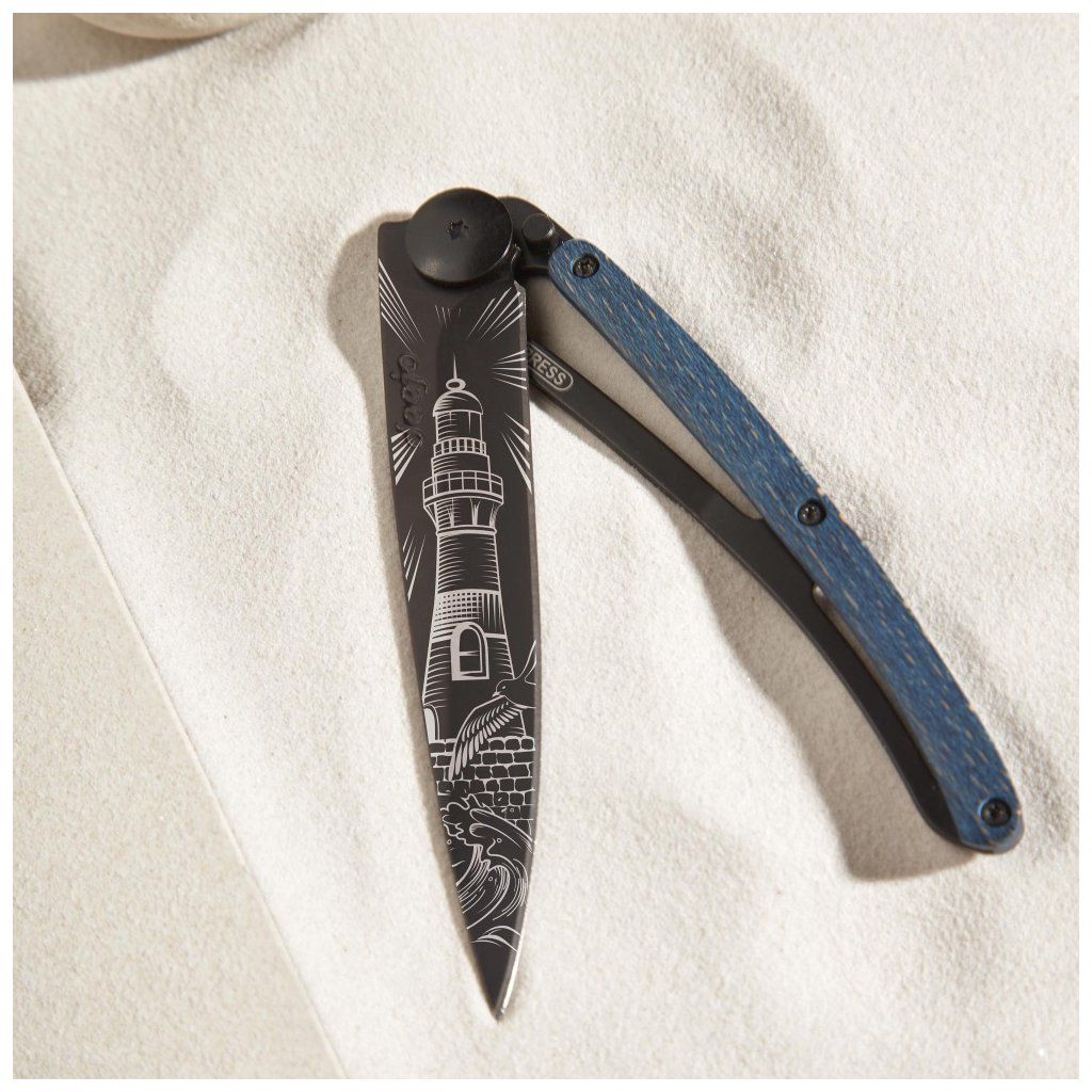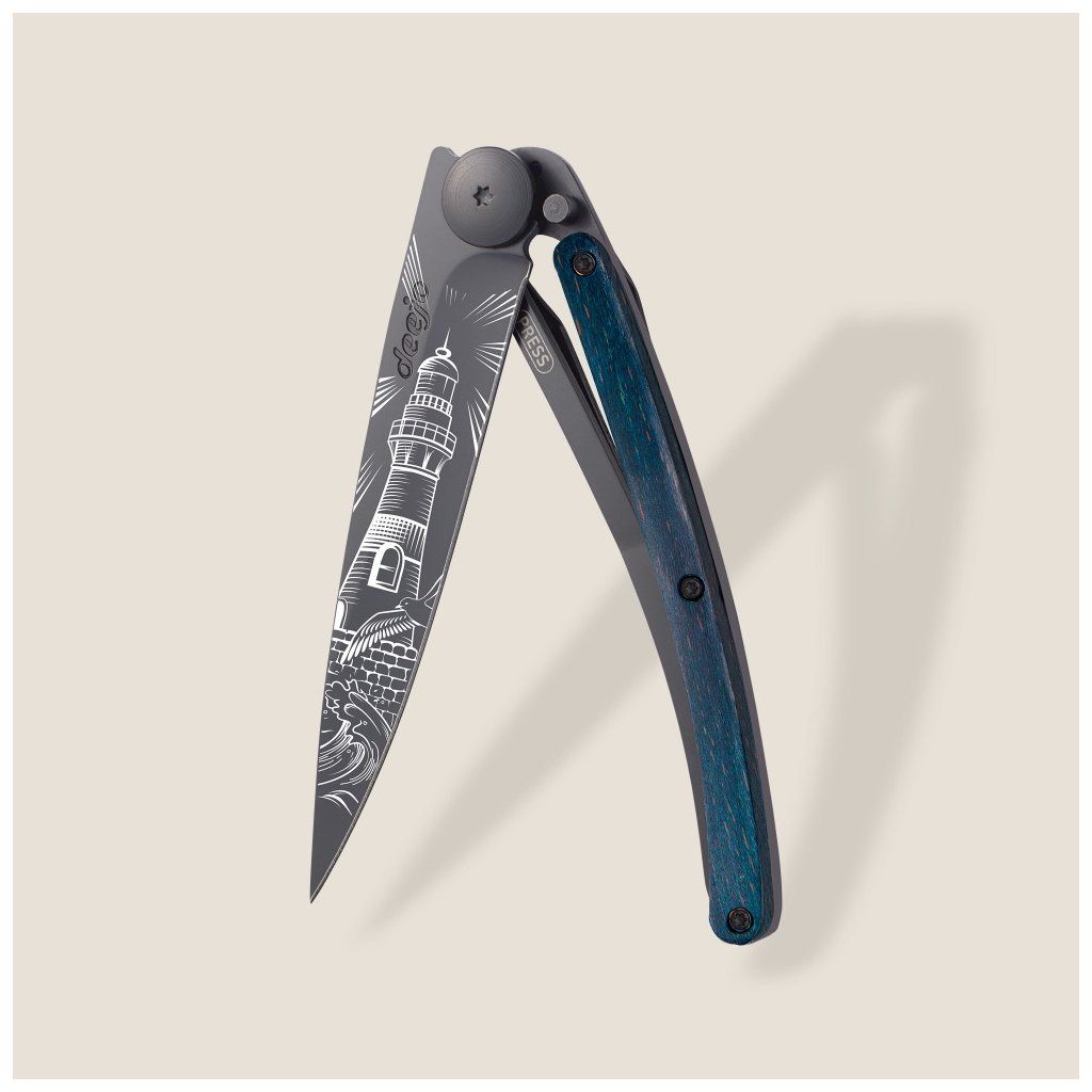 Stylový ultralehký nůž Deejo se střenkou z barevně mořeného bukového dřeva a motivem majáku.