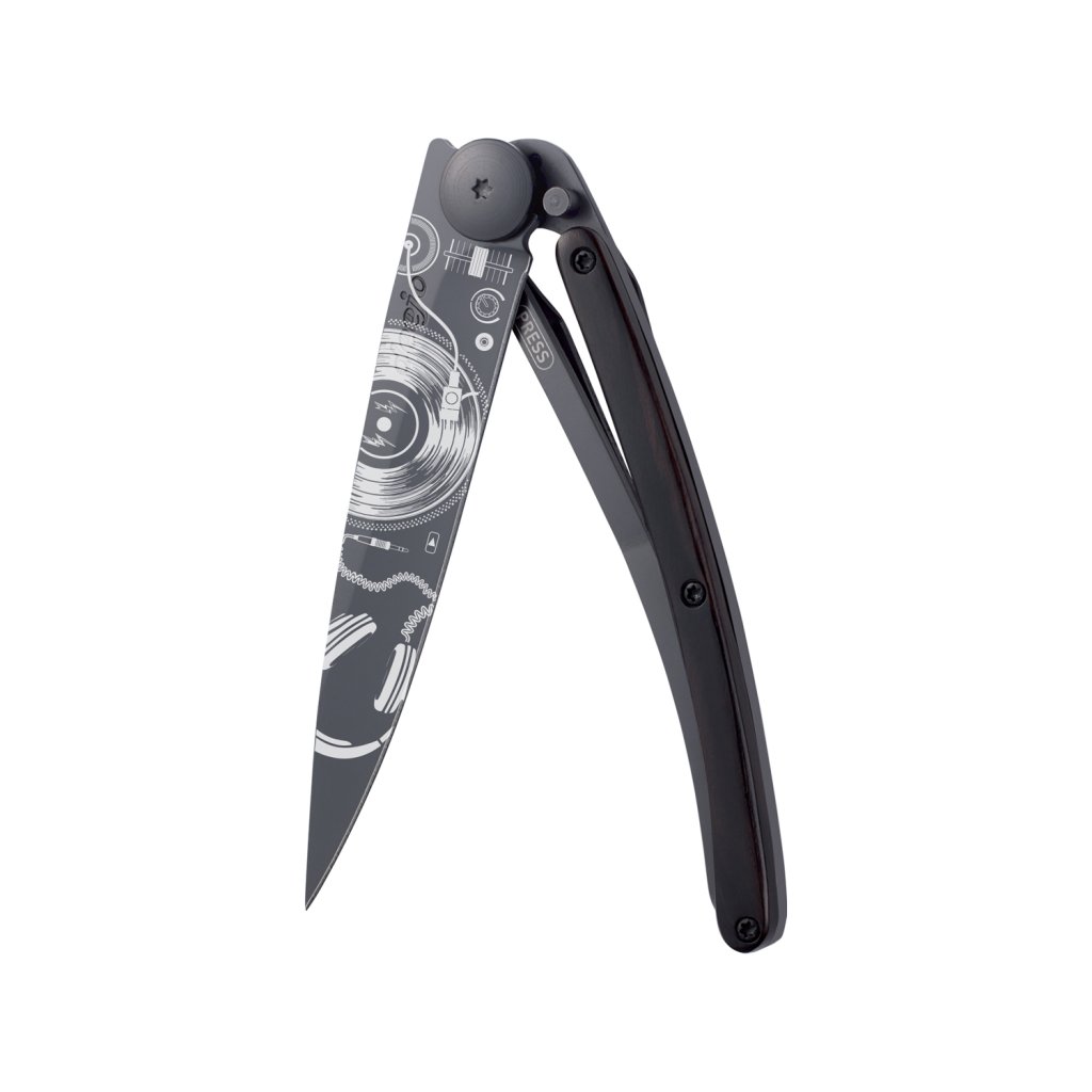 Stylový ultralehký nůž Deejo se střenkou z kořene exotického ebenového dřeva a motivem vinylové desky.