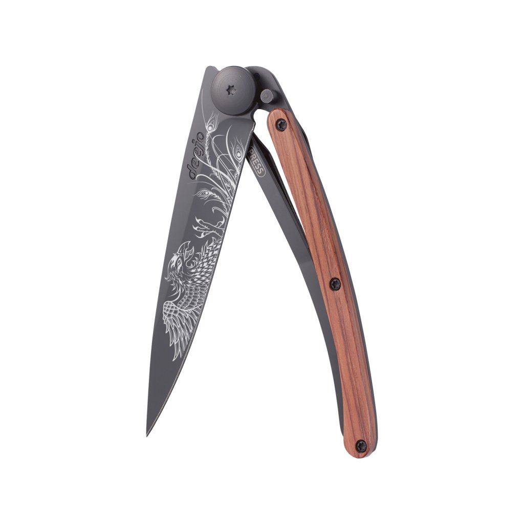 Stylový ultralehký nůž Deejo se střenkou z exotického dřeva coralwood a tetováním Fénixe.