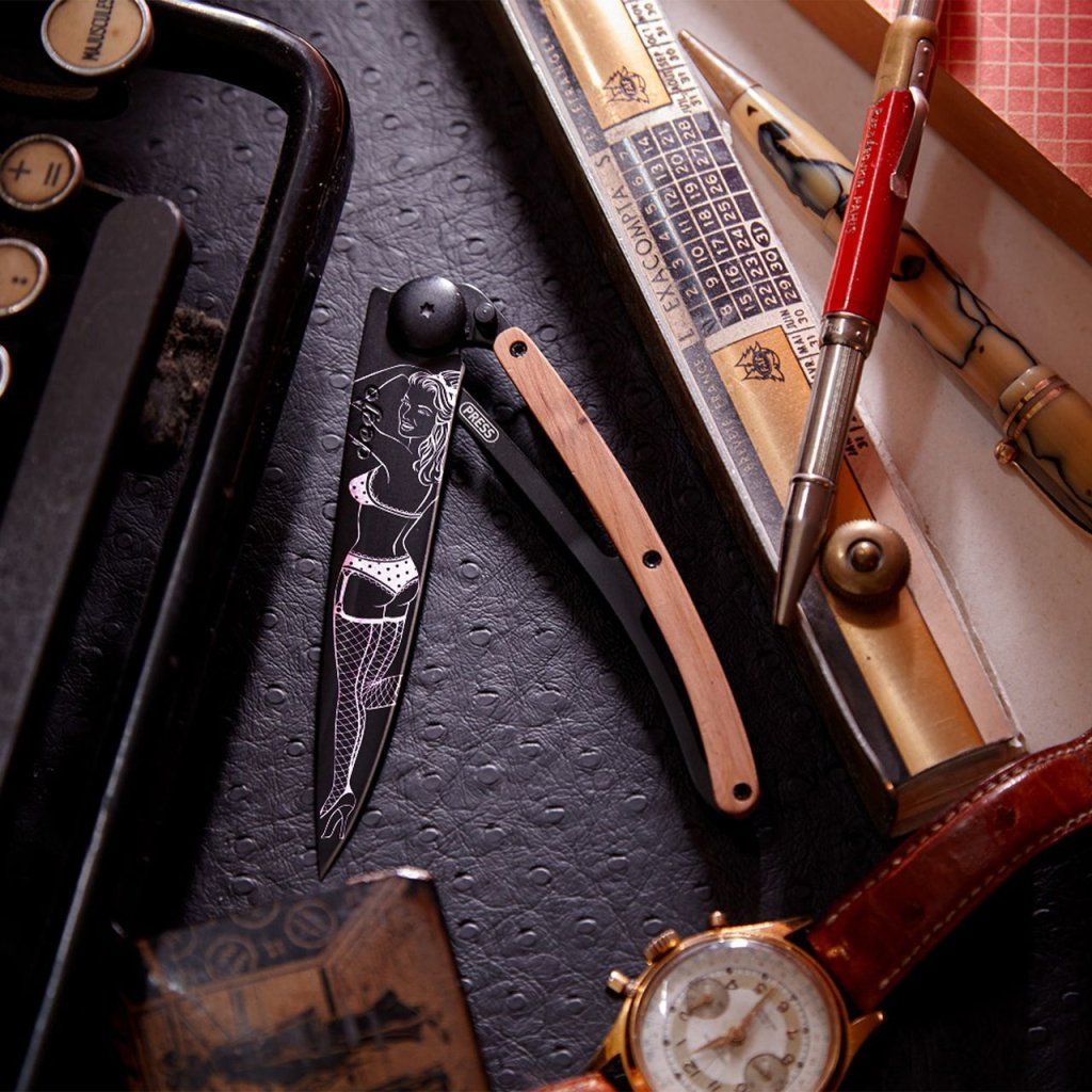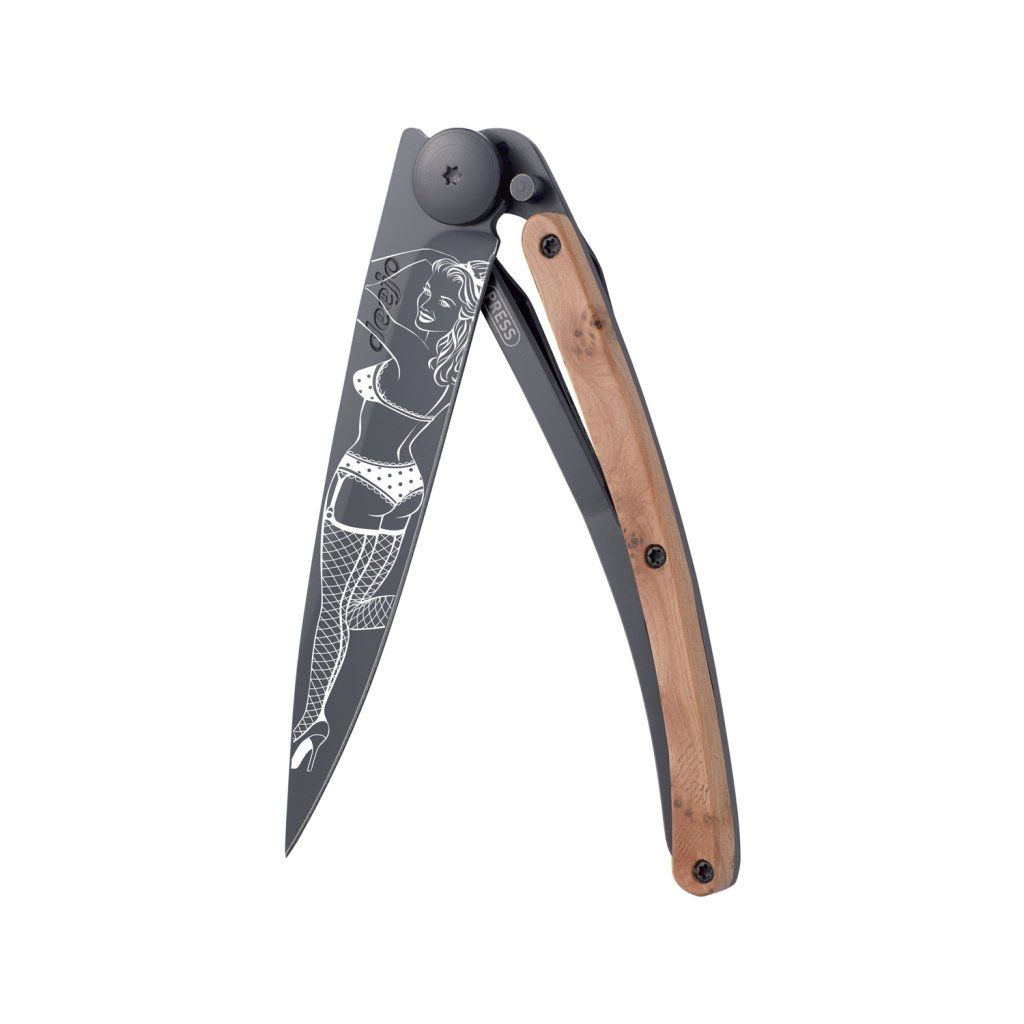 Stylový ultralehký nůž Deejo se střenkou z kořene exotického jalovce a tetováním pin-up modelky.