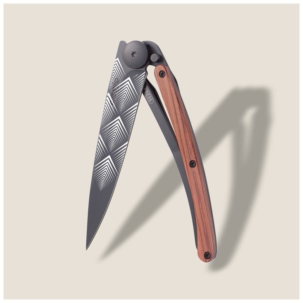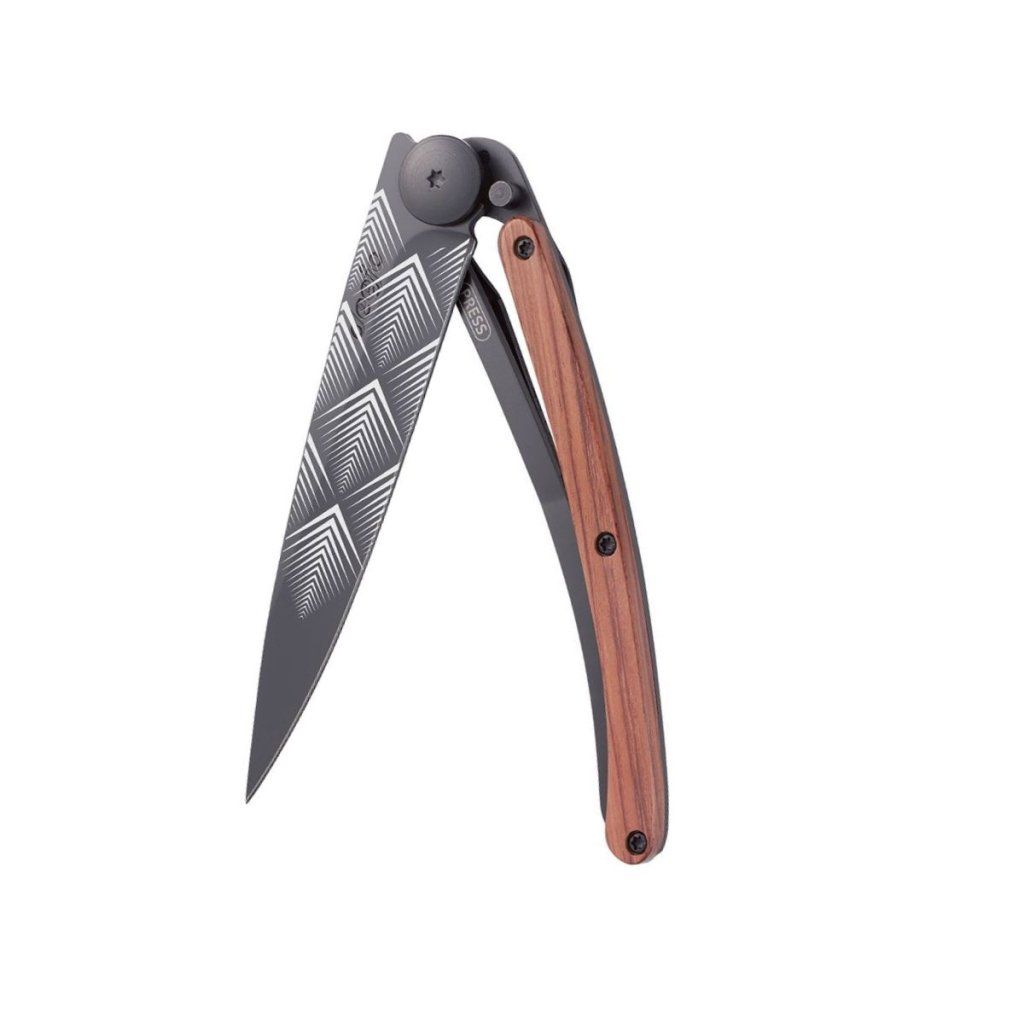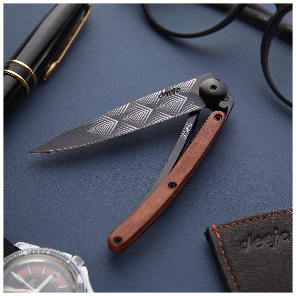 Stylový ultralehký nůž Deejo se střenkou z exotického dřeva coralwood a tetováním Art Deco.