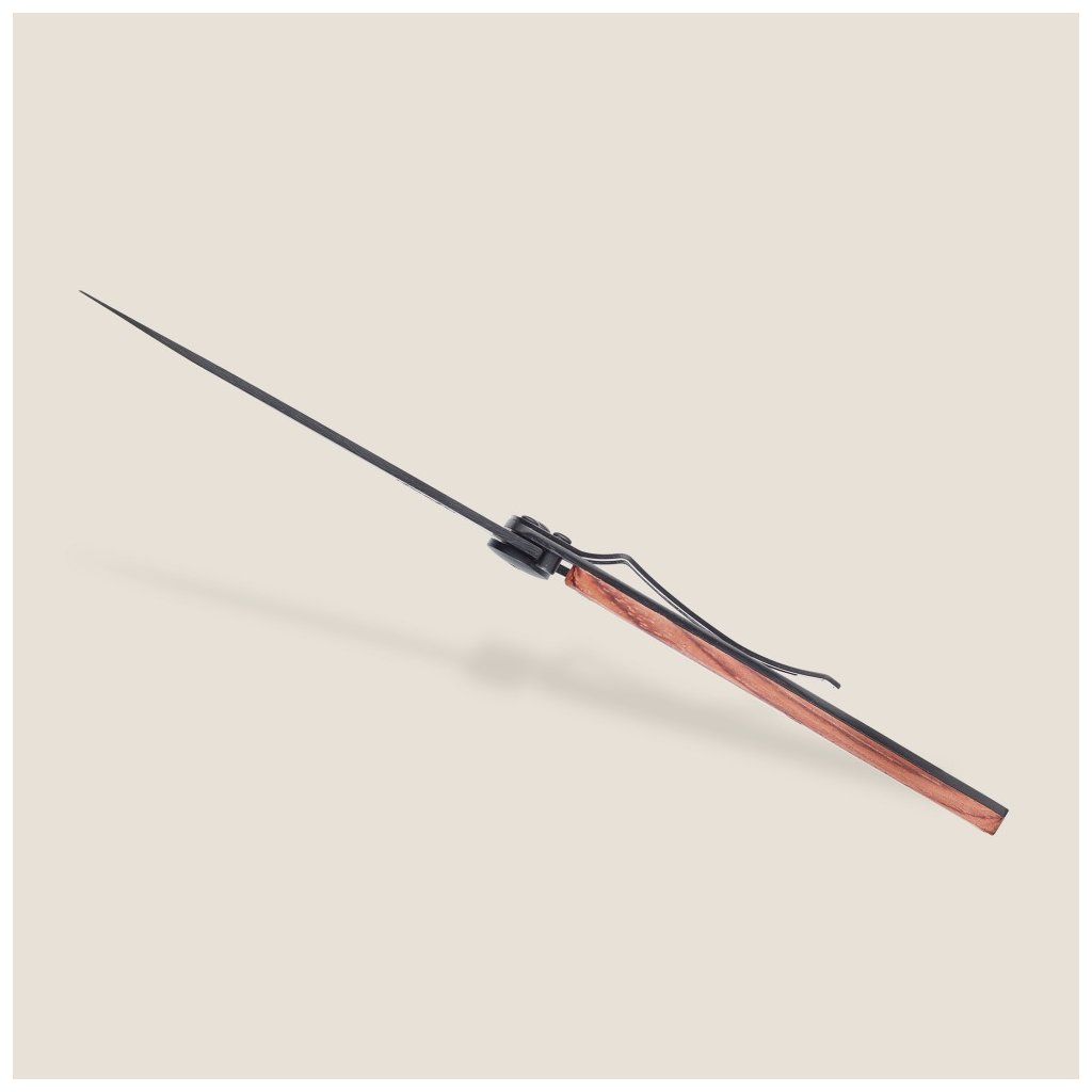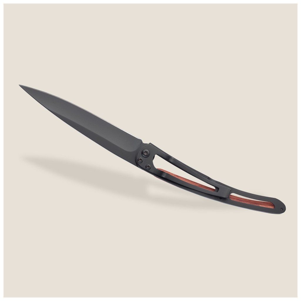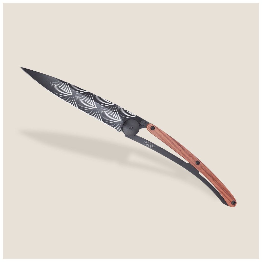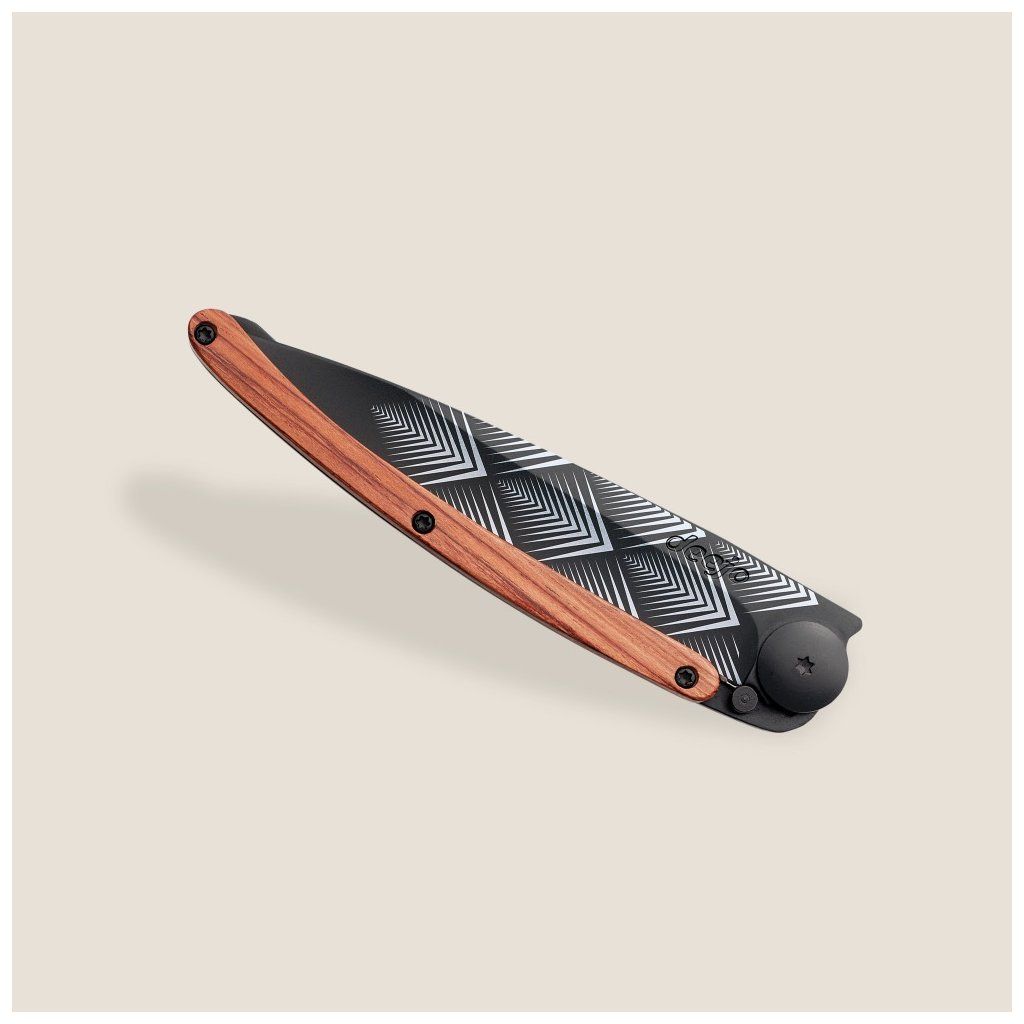 Stylový ultralehký nůž Deejo se střenkou z exotického dřeva coralwood a tetováním Art Deco.