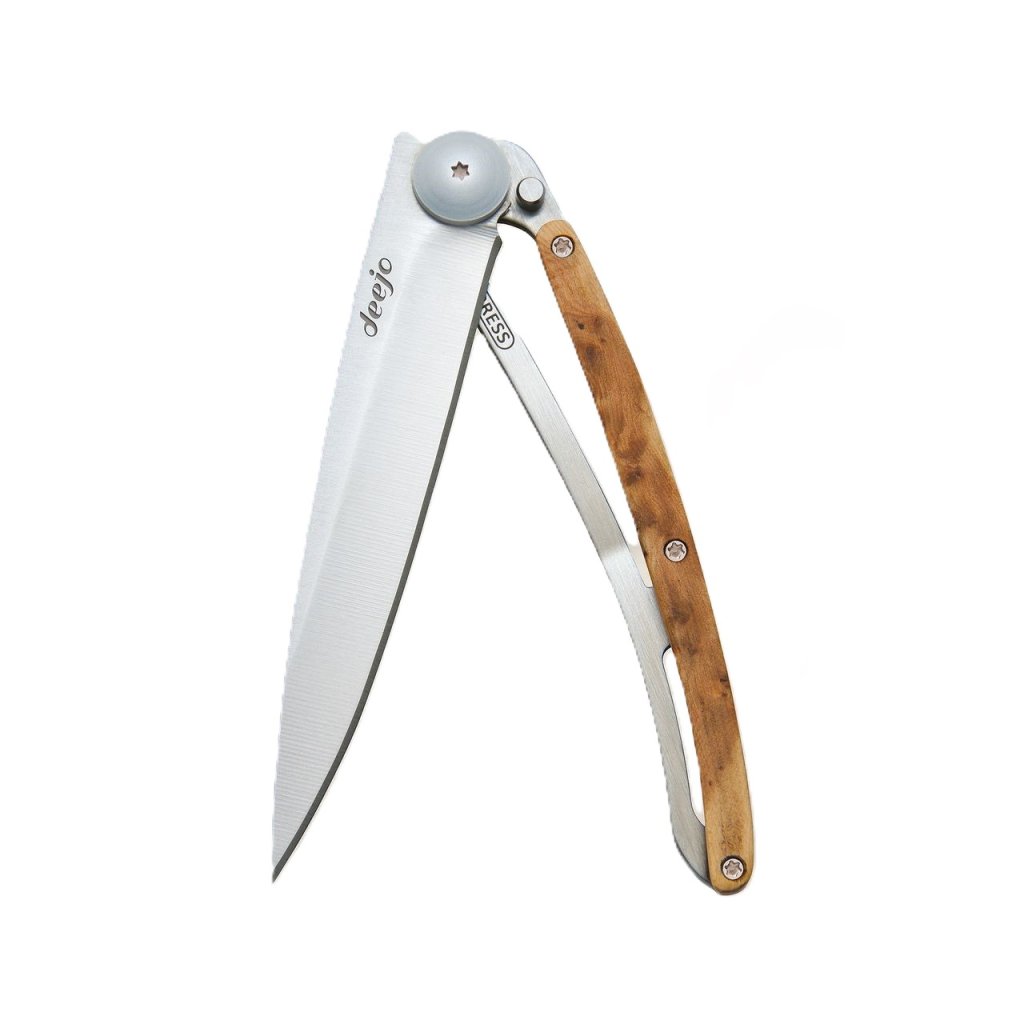 Stylový ultralehký nůž Deejo se střenkou z kořene exotického jalovce.