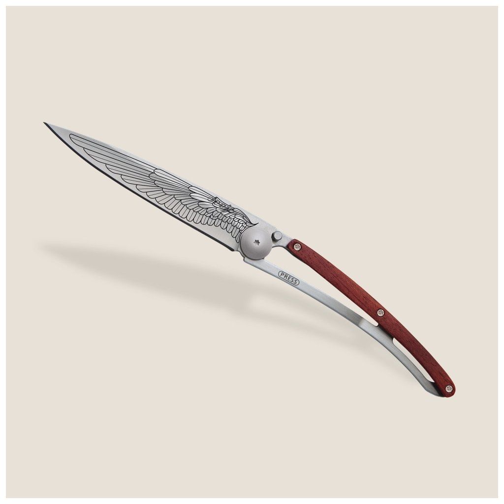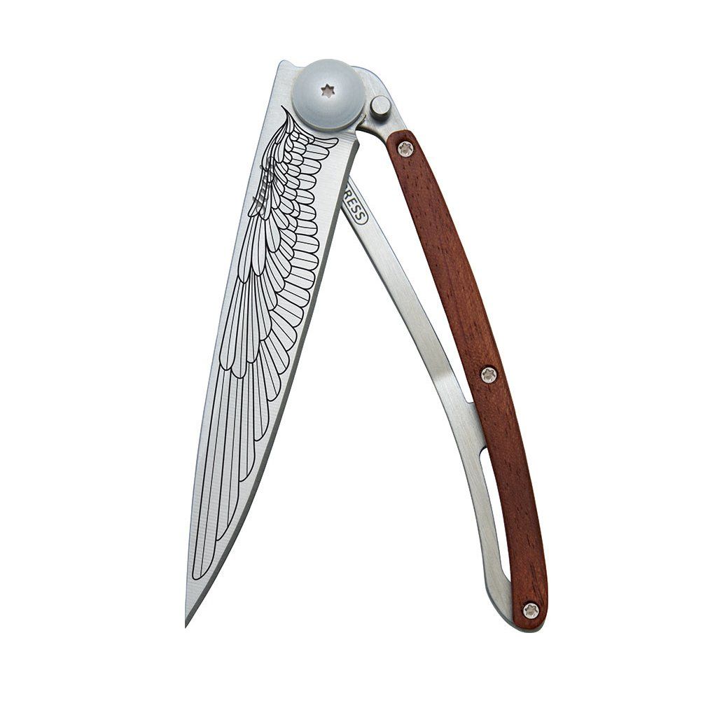 Stylový ultralehký nůž Deejo se střenkou z exotického dřeva coralwood a motivem "křídlo".
