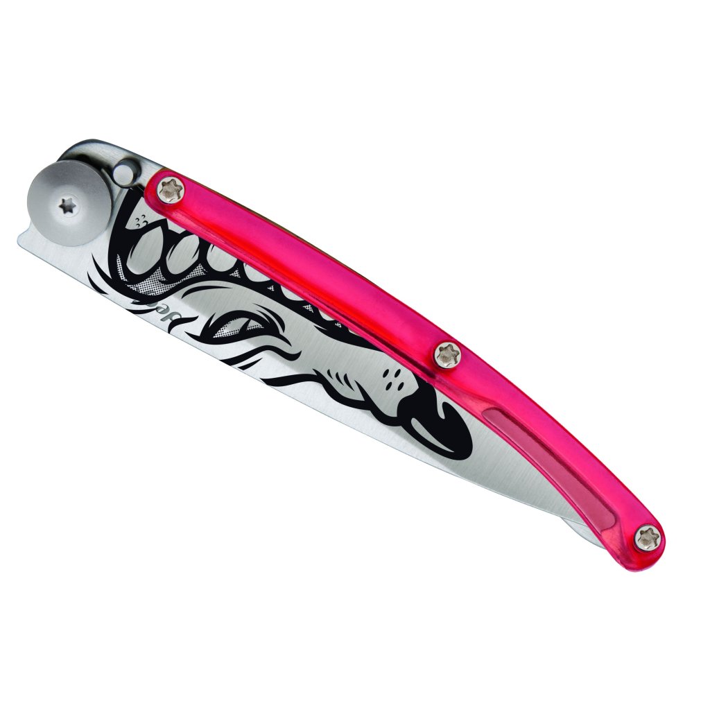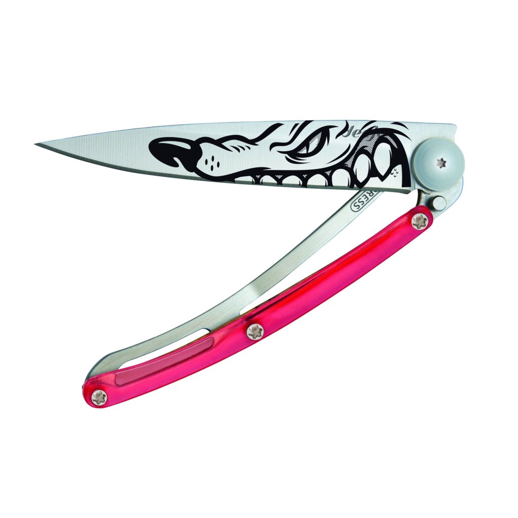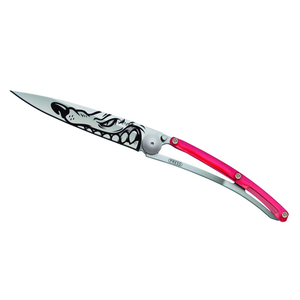 Stylový ultralehký nůž Deejo o hmotnosti 37g s plastovou střenkou v červené barvě s tetováním "winter".