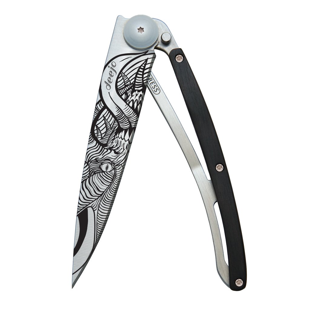 Stylový ultralehký nůž Deejo z kolekce Fantasy se střenkou z kořene exotického ebenového dřeva a tetováním "Demon".