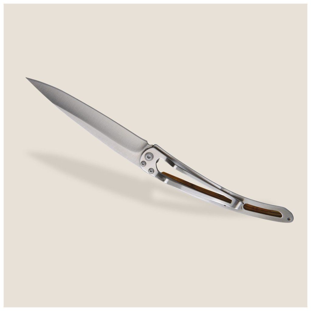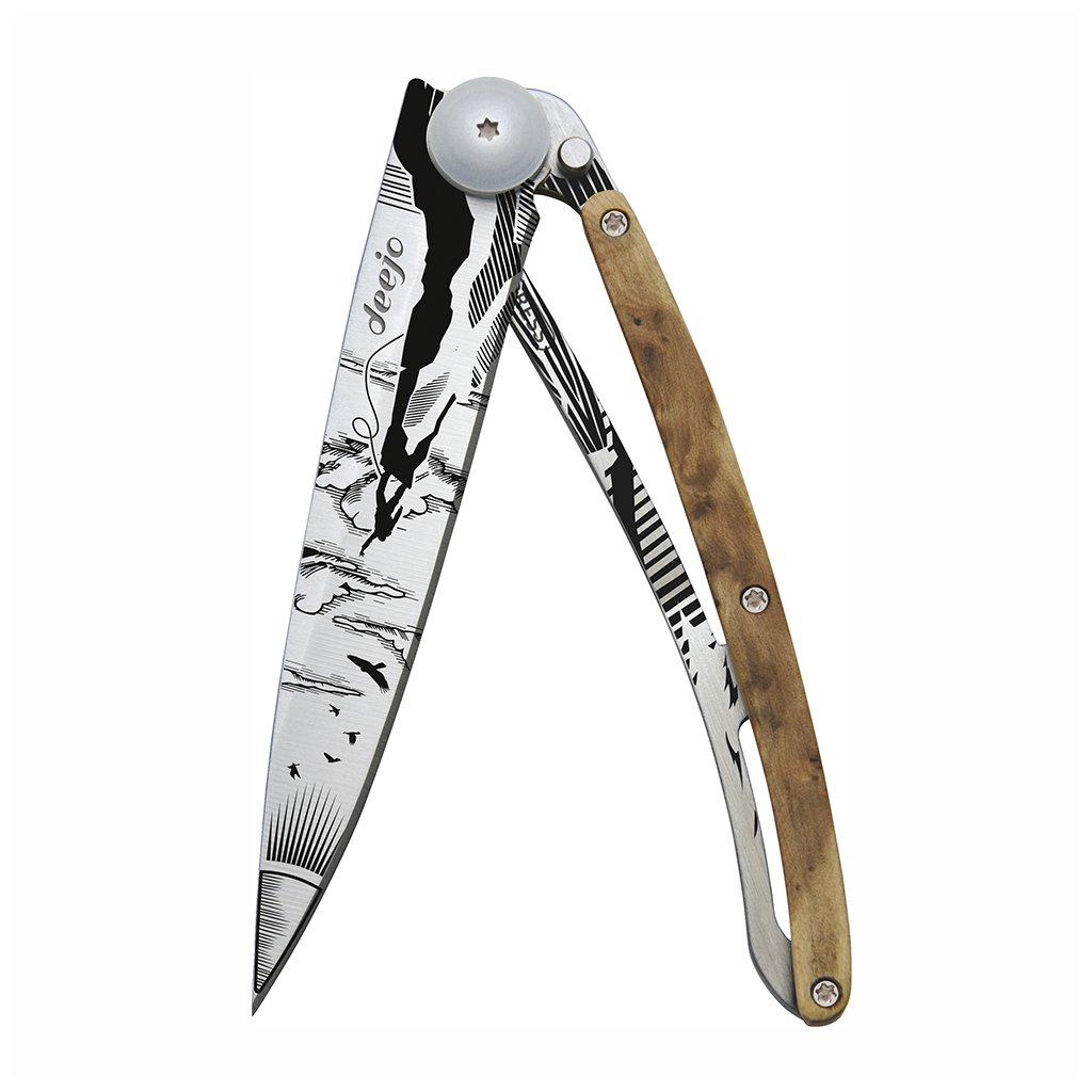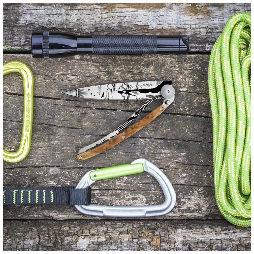 Stylový ultralehký nůž Deejo se střenkou z kořene exotického jalovce a tetováním "horolezec".