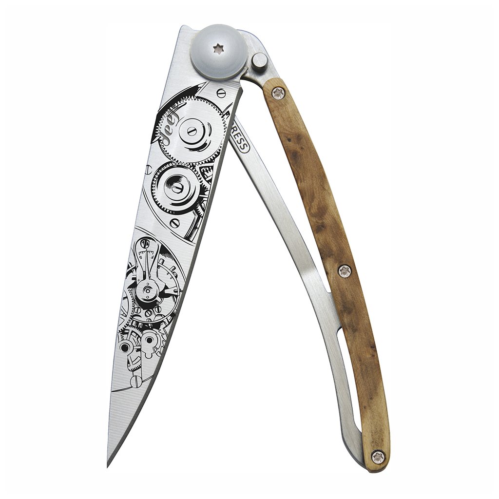 Stylový ultralehký nůž Deejo z kolekce Horlogerie se střenkou z kořene exotického jalovce a vytetováným hodinářským motivem.