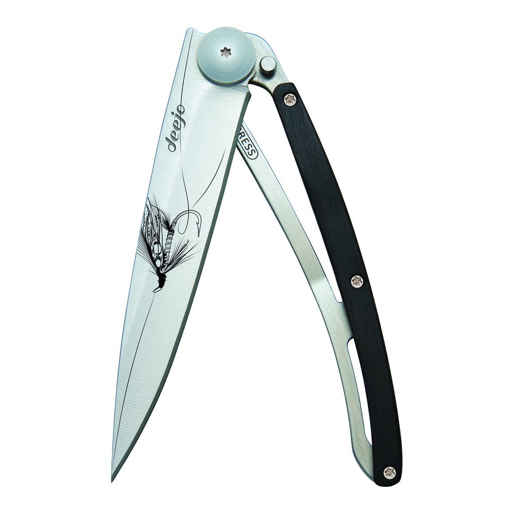 Stylový ultralehký nůž Deejo z kolekce Nature se střenkou z kořene exotického ebenového dřeva a tetováním "stříbrný wilkinson".