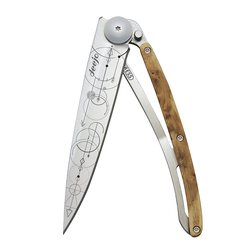 Stylový ultralehký nůž Deejo se střenkou z kořene exotického jalovce a tetováním "teorém".