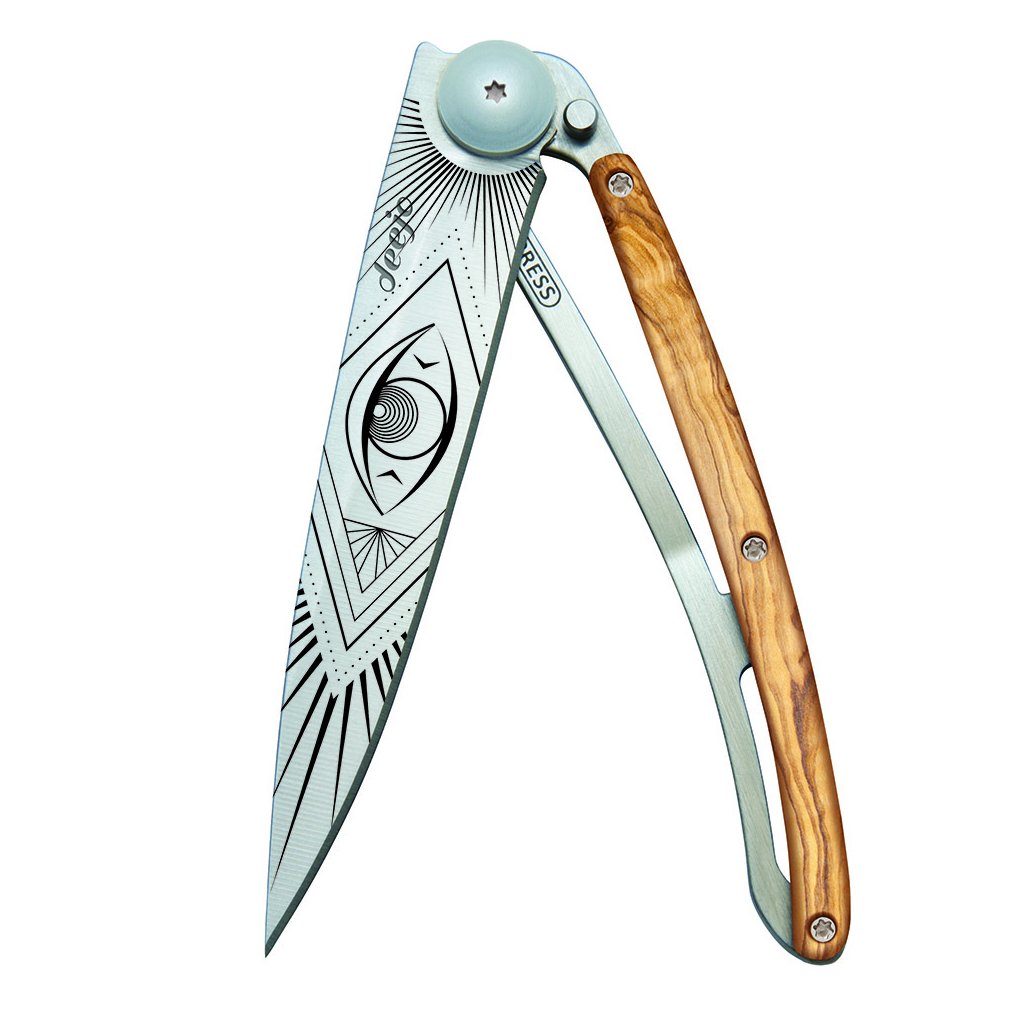 Stylový ultralehký nůž Deejo se střenkou z olivového dřeva a motivem "vize".