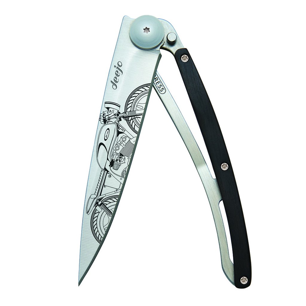 Stylový ultralehký nůž Deejo se střenkou z kořene exotického ebenového dřeva a motivem "café racer".