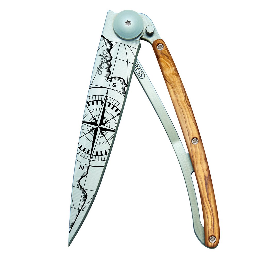 Stylový ultralehký nůž Deejo se střenkou z olivového dřeva a motivem "Země neznámá".