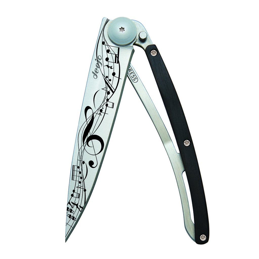 Stylový ultralehký nůž Deejo se střenkou z kořene exotického ebenového dřeva a motivem "hudební partitura".