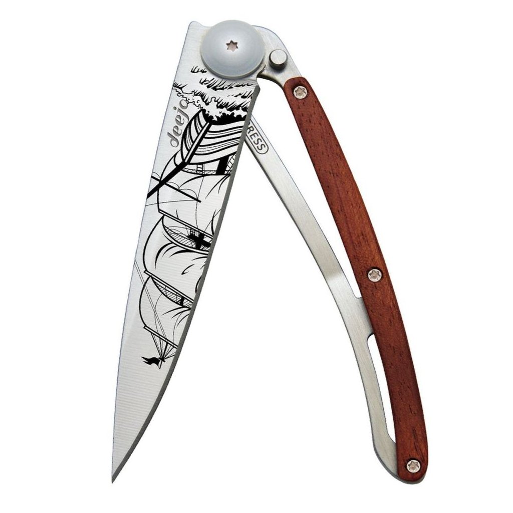 Stylový ultralehký nůž Deejo se střenkou z exotického dřeva coralwood a tetováním korábu.