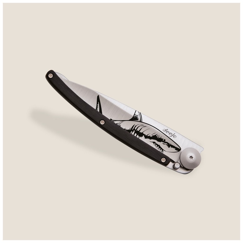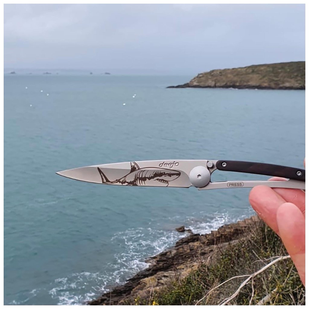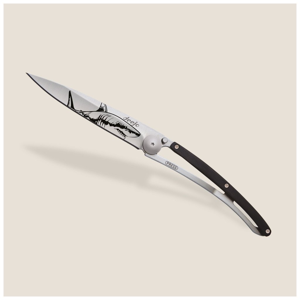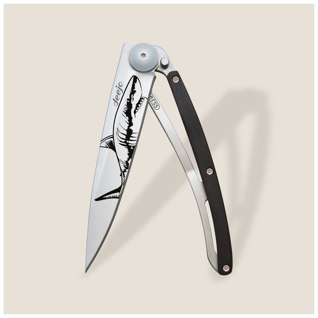 Stylový ultralehký nůž Deejo se střenkou z kořene exotického ebenového dřeva a tetováním "Žralok".
