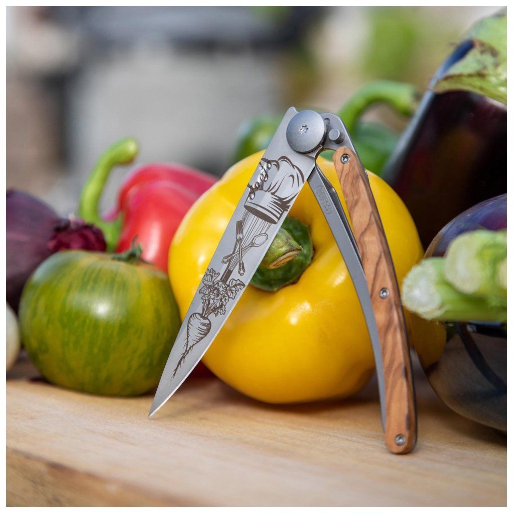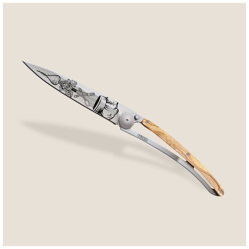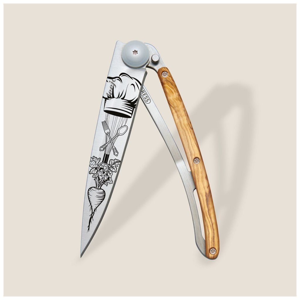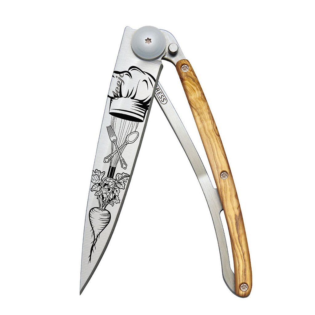 Stylový ultralehký nůž Deejo se střenkou z olivového dřeva a motivem "šéfkuchař".