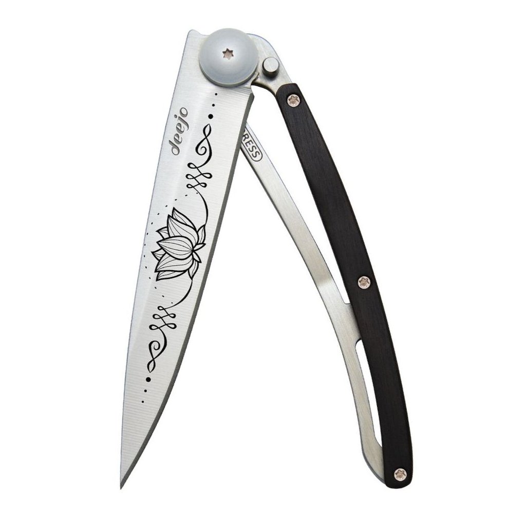 Stylový ultralehký nůž Deejo se střenkou z kořene exotického ebenového dřeva a tetováním "Zen".