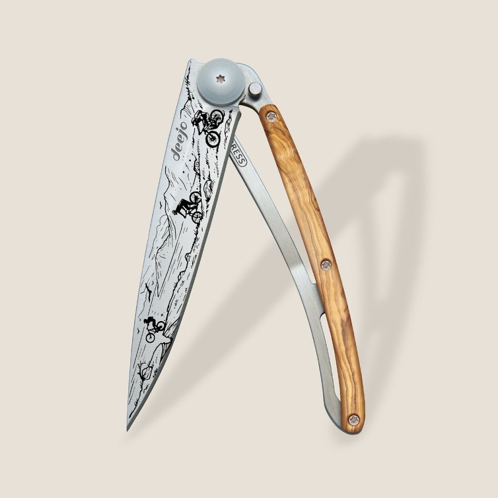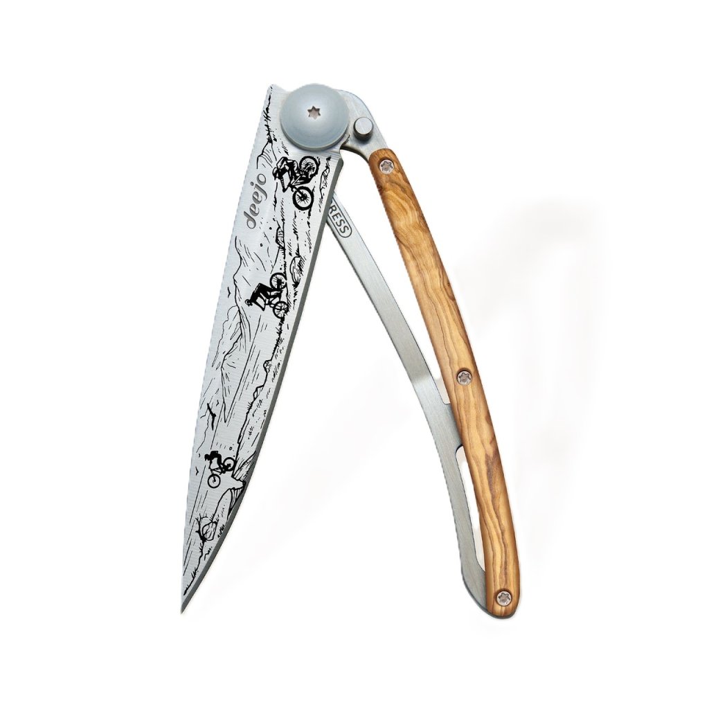 Stylový ultralehký nůž Deejo se střenkou z olivového dřeva a motivem horských kol.